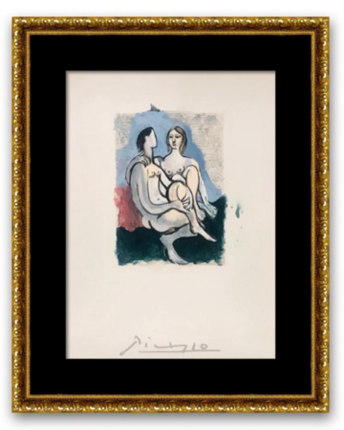 Artist: Pablo Picasso. Medium: Lithograph on Arches Paper. Title: La Couple. Size (Unframed): 29" x 22". Size (Framed): 40" x 30". Certificate of Authenticity: Is included. Additional: Portfolio: Marina Picasso Estate Lithograph Collection. Printer: Laurent Marcel Salinas (Chromist). Date: of Original: 1930 | Year Printed: 1979-1982. Publisher: Estate of Picasso (Marina Picasso). Reference# 12802.