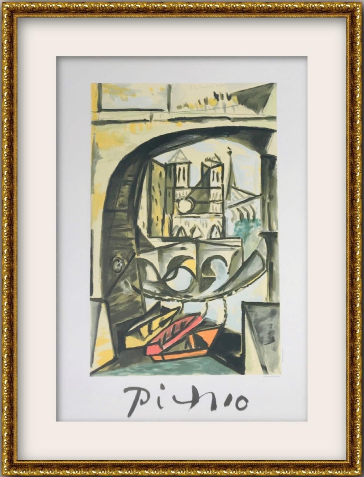 Artist: Pablo Picasso. Medium: Lithograph on Arches Paper. Title: Notre Dame. Size (Unframed): 29" x 22". Size (Framed): 40" x 30". Certificate of Authenticity: Is  included. Additional: Portfolio: Marina Picasso Estate Lithograph Collection. Printer: Laurent Marcel Salinas (Chromist). Date: of Original:1944 | Year Printed: 1979-1982. Publisher: Estate of Picasso (Marina Picasso). Reference# 12797.