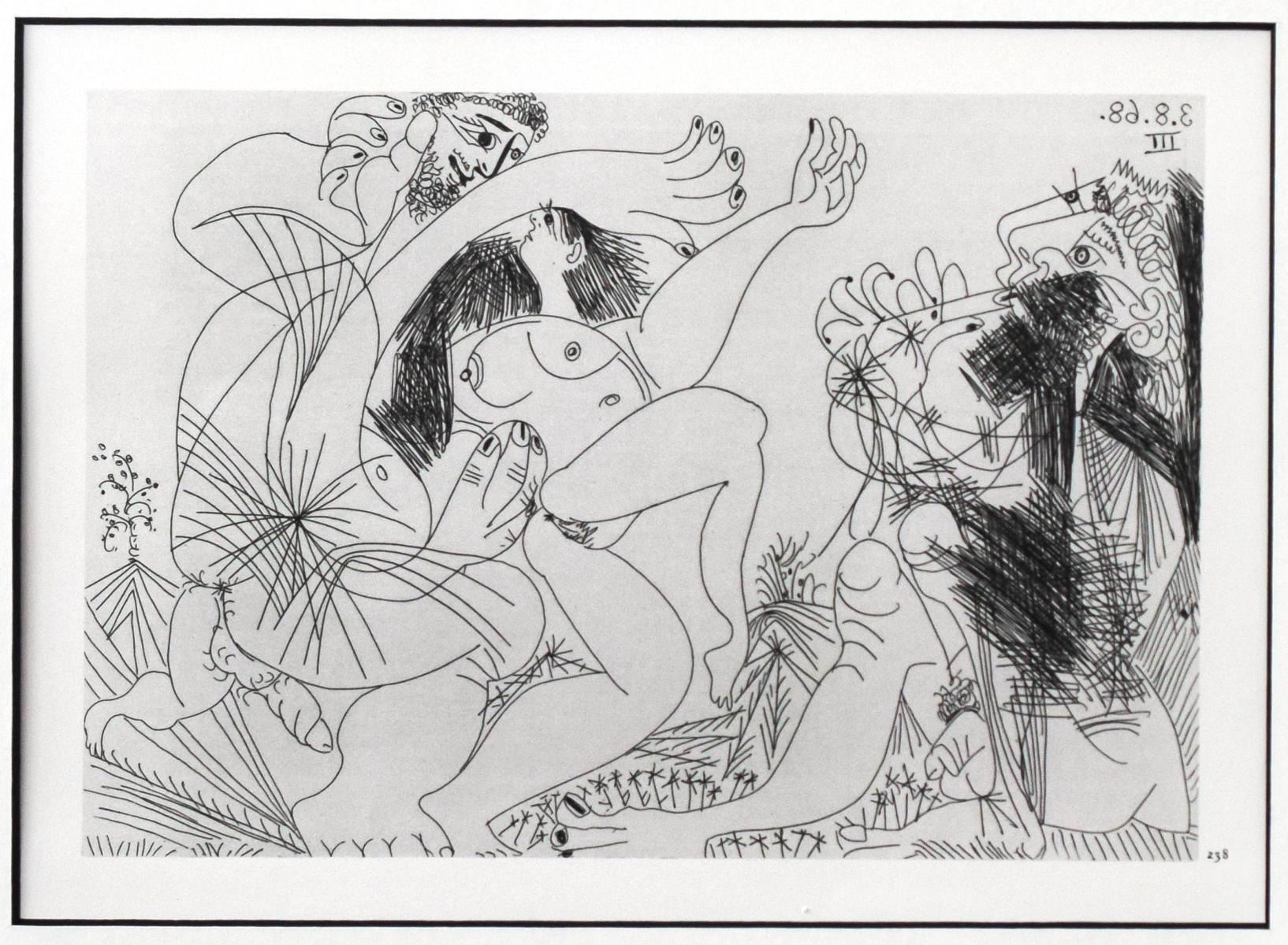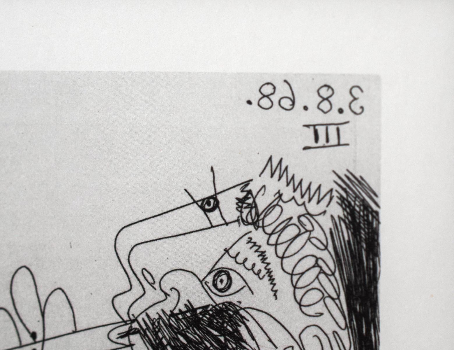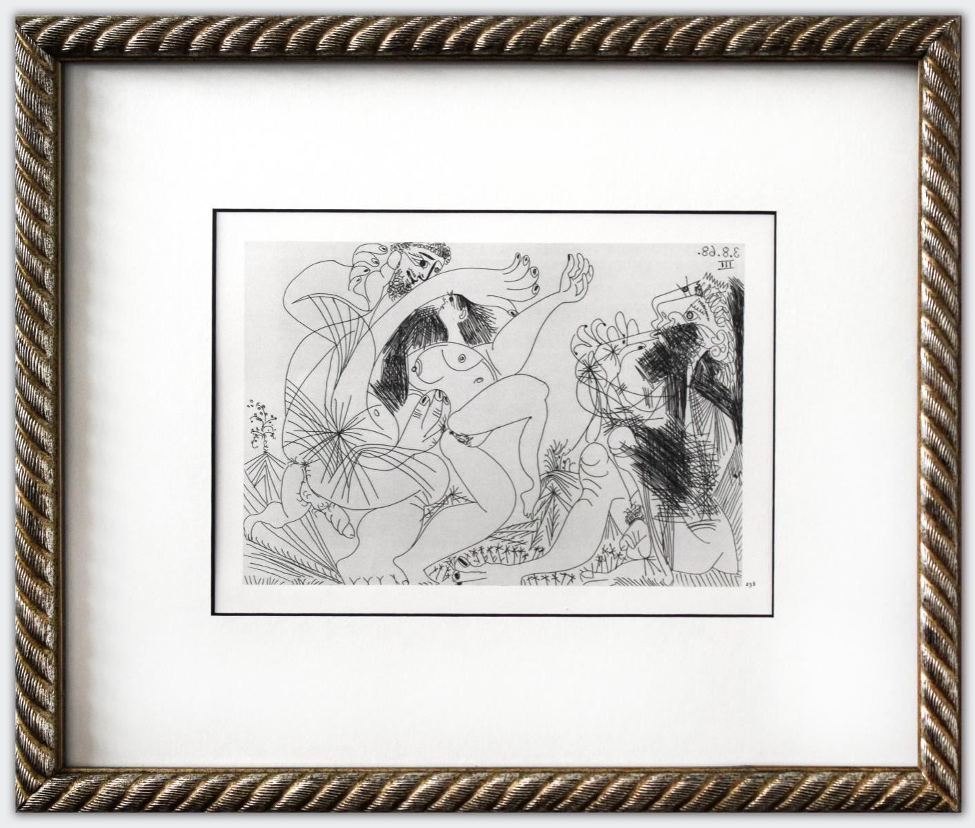 Artist: Pablo Picasso. Medium: Offset Lithograph. Title: From The 347 Series. Size (Unframed): 7.5" x 11". Size (Framed): 15" x 18". Additional: Custom framed. Unsigned and unnumbered. The 347 Series is a series of Gravures by the Spanish artist Pablo Picasso executed between March 16 and October 8 1968. The work was Picasso's largest in terms of the number of individual prints in the series. It was dedicated to his friend Jamie Sabartes. No name was given by Picasso to the series. The 347 series was first displayed at the Art Institute of Chicago and Paris's Gallerie Lousie Leris in 1970.This framed reproduction of an original gravure in the series was published by Random House inc in the USA and printed in Switzerland.. Reference# 16028.