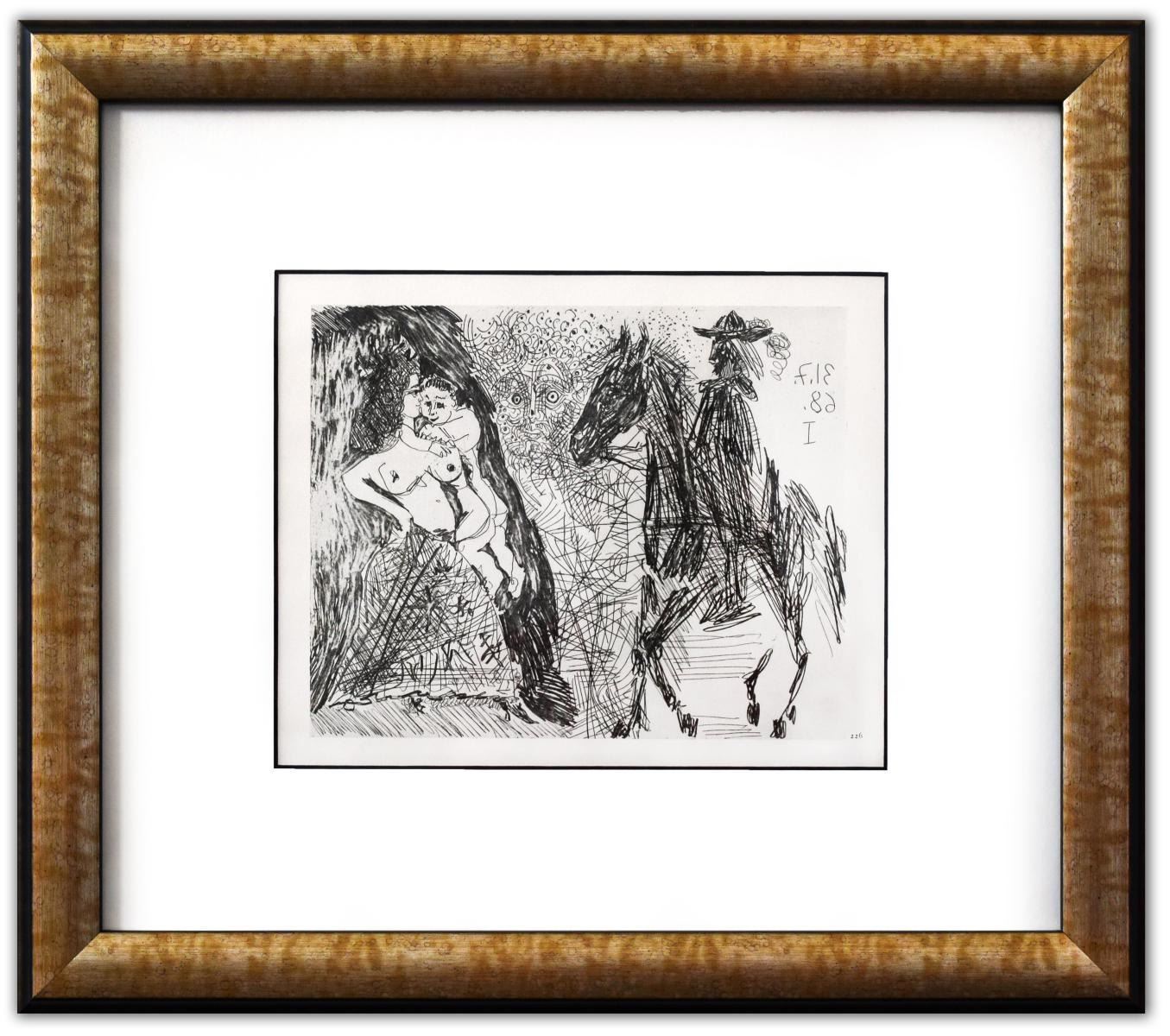 Artist: Pablo Picasso. Medium: Offset Lithograph. Title: From The 347 Series. Size (Unframed): 8" x 9". Size (Framed): 15" x 17". Additional: Custom framed. Unsigned and unnumbered. The 347 Series is a series of Gravures by the Spanish artist Pablo Picasso executed between March 16 and October 8 1968. The work was Picasso's largest in terms of the number of individual prints in the series. It was dedicated to his friend Jamie Sabartes. No name was given by Picasso to the series. The 347 series was first displayed at the Art Institute of Chicago and Paris's Gallerie Lousie Leris in 1970.This framed reproduction of an original gravure in the series was published by Random House inc in the USA and printed in Switzerland.. Reference# 16562.
