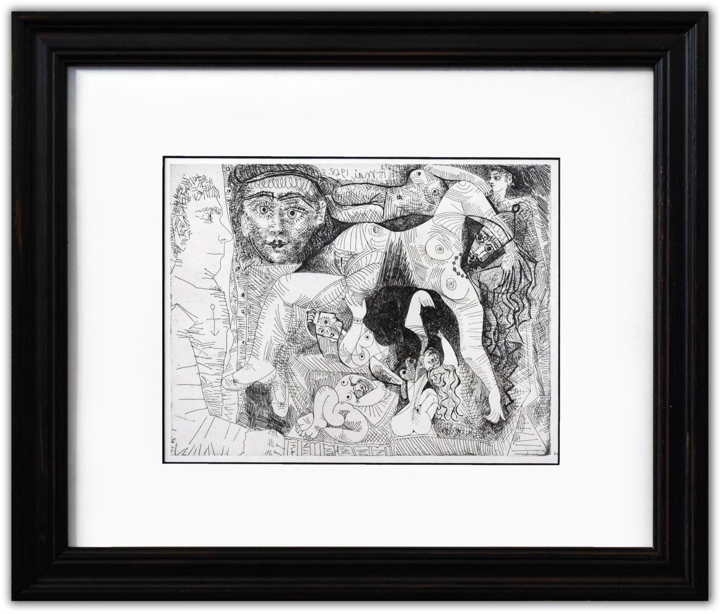 Artist: Pablo Picasso. Medium: Offset Lithograph. Title: From The 347 Series. Size (Unframed): 9" x 11". Measures approx. (Framed): 17" x 19". Additional: Custom framed. Unsigned and unnumbered. The 347 Series is a series of Gravures by the Spanish artist Pablo Picasso executed between March 16 and October 8 1968. The work was Picasso's largest in terms of the number of individual prints in the series. It was dedicated to his friend Jamie Sabartes. No name was given by Picasso to the series. The 347 series was first displayed at the Art Institute of Chicago and Paris's Gallerie Lousie Leris in 1970.This framed reproduction of an original gravure in the series was published by Random House inc in the USA and printed in Switzerland.. Reference# 16602.