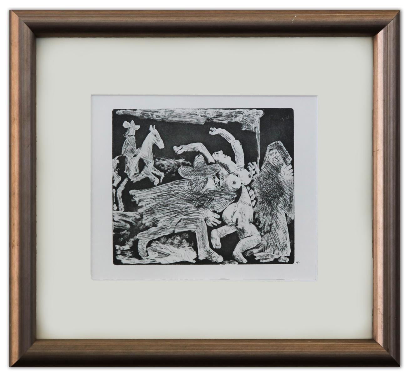 Artist: Pablo Picasso. Medium: Offset Lithograph. Title: From The 347 Series. Size (Unframed): 7" x 9". Measures approx. (Framed): 14" x 16". Additional: Custom framed. Unsigned and unnumbered. The 347 Series is a series of Gravures by the Spanish artist Pablo Picasso executed between March 16 and October 8 1968. The work was Picasso's largest in terms of the number of individual prints in the series. It was dedicated to his friend Jamie Sabartes. No name was given by Picasso to the series. The 347 series was first displayed at the Art Institute of Chicago and Paris's Gallerie Lousie Leris in 1970.This framed reproduction of an original gravure in the series was published by Random House inc in the USA and printed in Switzerland.. Reference# 18022.