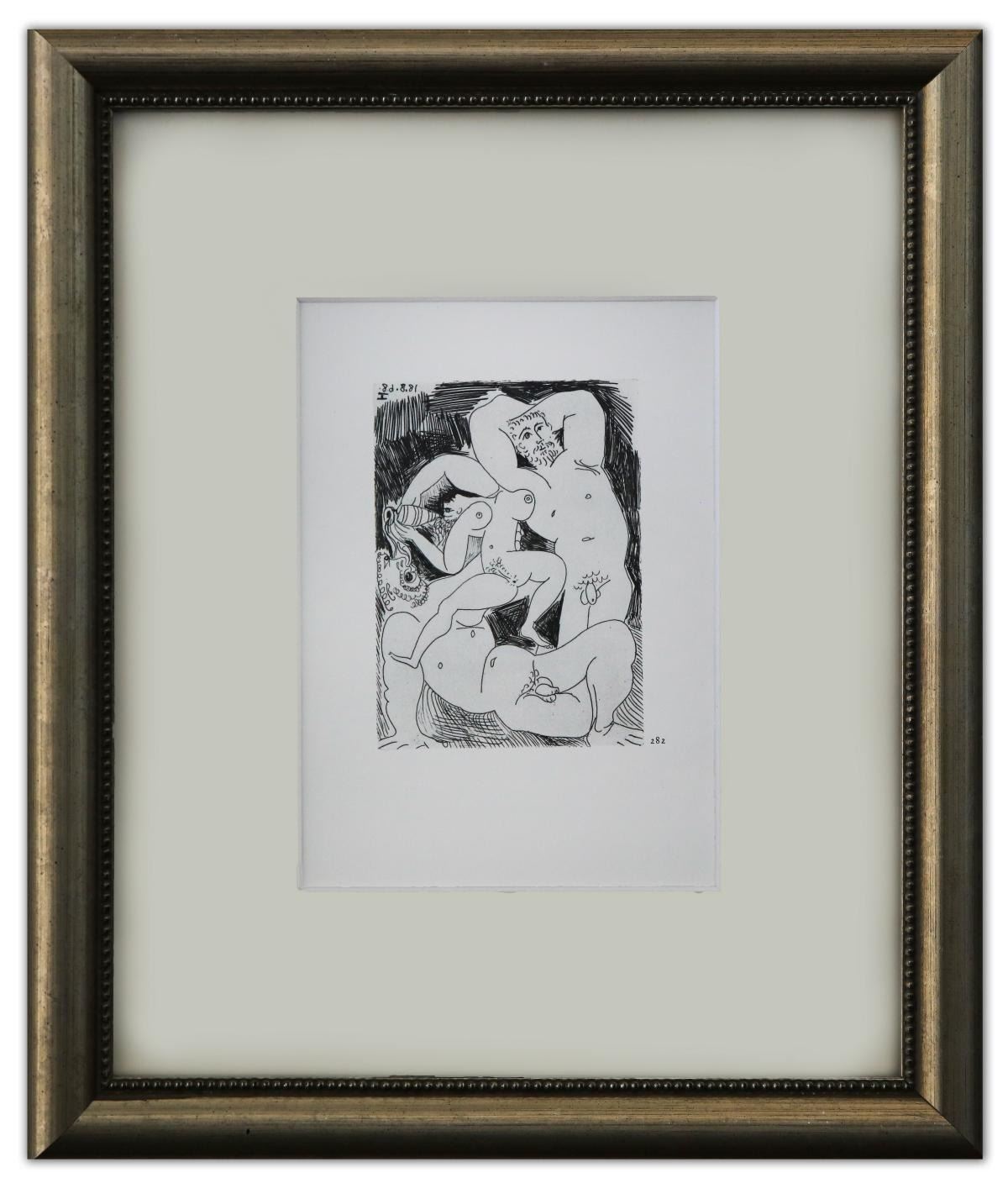 Artist: Pablo Picasso. Medium: Offset Lithograph. Title: From The 347 Series. Size (Unframed): 7" x 5". Measures approx. (Framed): 14" x 12". Additional: Custom framed. Unsigned and unnumbered. The 347 Series is a series of Gravures by the Spanish artist Pablo Picasso executed between March 16 and October 8 1968. The work was Picasso's largest in terms of the number of individual prints in the series. It was dedicated to his friend Jamie Sabartes. No name was given by Picasso to the series. The 347 series was first displayed at the Art Institute of Chicago and Paris's Gallerie Lousie Leris in 1970.This framed reproduction of an original gravure in the series was published by Random House inc in the USA and printed in Switzerland.. Reference# 18024.