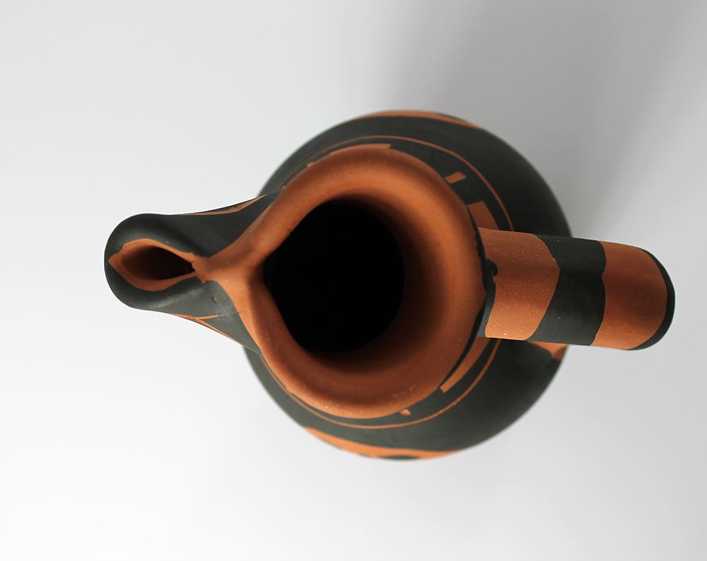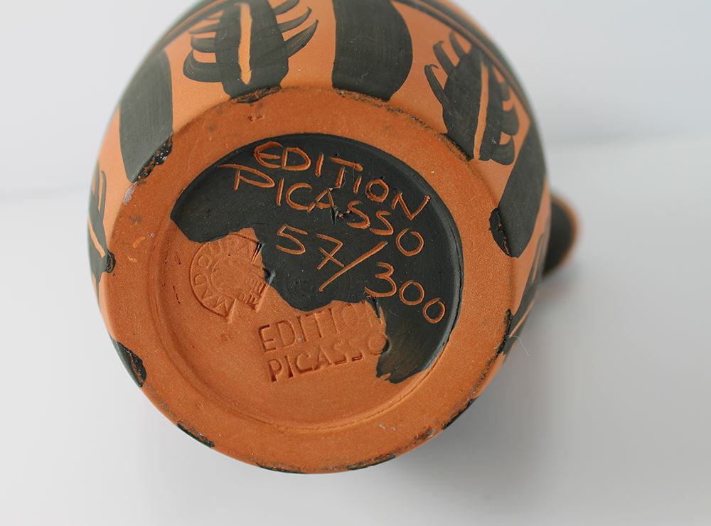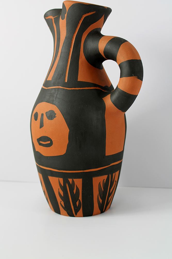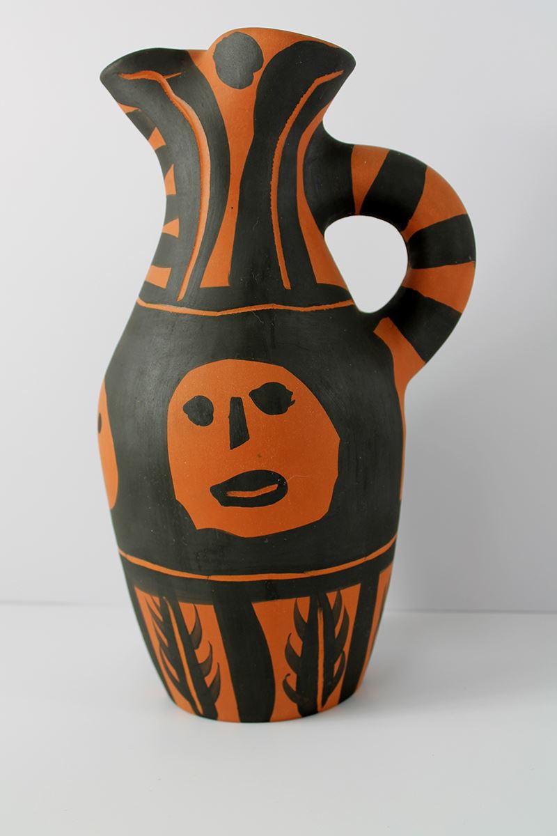 Pablo Picasso. "Yan-Jug, Black Headband" An original Picasso ceramic with red clay partially painted in black. Inscribed and numbered 57/300 on the bottom, Edition Picasso and Stamped "Madoura Edition Picasso". 1963. Condition is excellent with no chips, cracks or repairs. 27 cm x 13 cm x 13 cm (c. 10 5/8 x 5 1/8 x 5 1/8 inches). Can be referenced by Ramie no. 514; Ramie, Alain. Picasso: Catalog of the edited ceramic works 1947/1971. Accompanied by a Certificate of Authenticity
