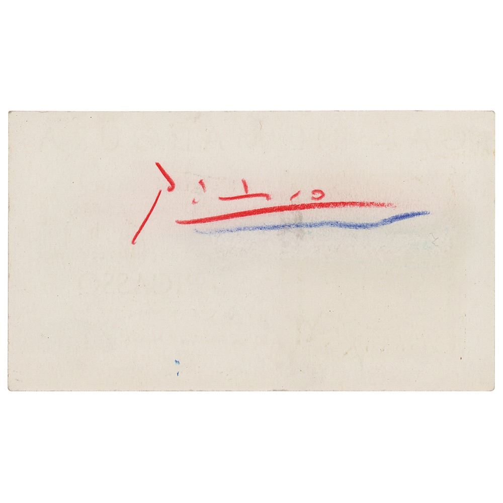 Fantastic red pencil signature, "Picasso,†underlined in blue, on the reverse of an off-white 5.5 x 3.25 promo card for "Galerie Madoura" in Cannes, purveyor of "céramiques originales et éditées de Picasso." In fine condition.
