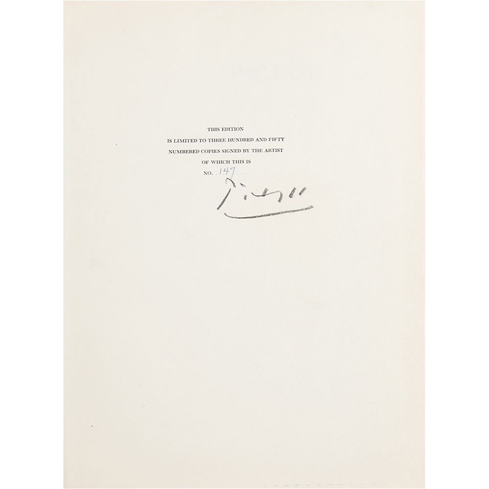 Signed book: Picasso: The Recent Years 1939–1946. Limited edition, numbered 147/350. Garden City, NY: Doubleday, 1947. Hardcover, 8.75 x 11, 211 pages. Beautifully signed on the colophon in pencil, "Picasso." Autographic condition: very fine. Book condition: NF in a VG- slipcase, with some edgewear, scuffing, and small tape repair to the slipcase. A wonderful limited edition retrospective of Picasso's World War II-era work.