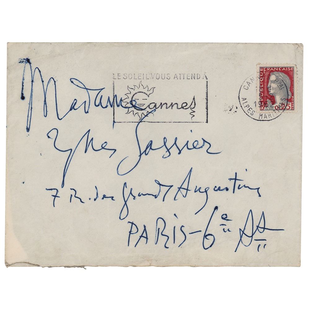 Hand-addressed and signed mailing envelope, 5.75 x 4.25, addressed by Picasso to "Madame Ines Sassier, 7 Rue des Grands Augustins, Paris 6e As.," and signed as part of the return address on the flap: "Envoi Picasso, Mas N. D. de V., Mougins, A.M." Postmarked at Cannes in 1962. In very good to fine condition, with light overall creasing.