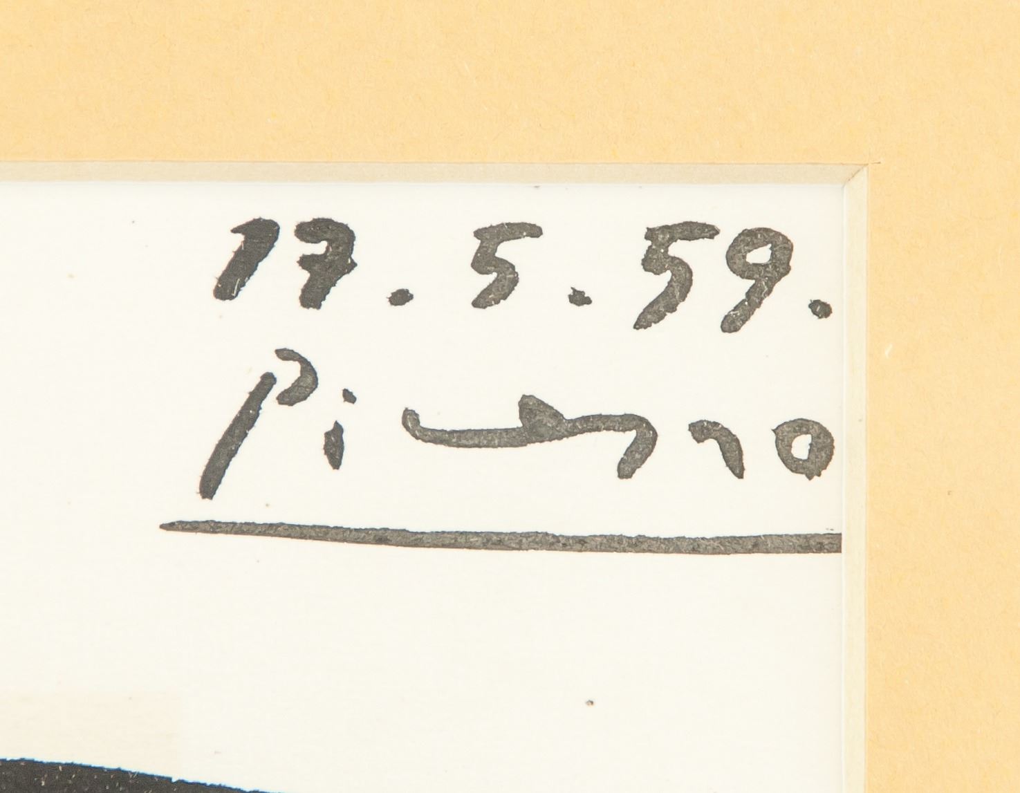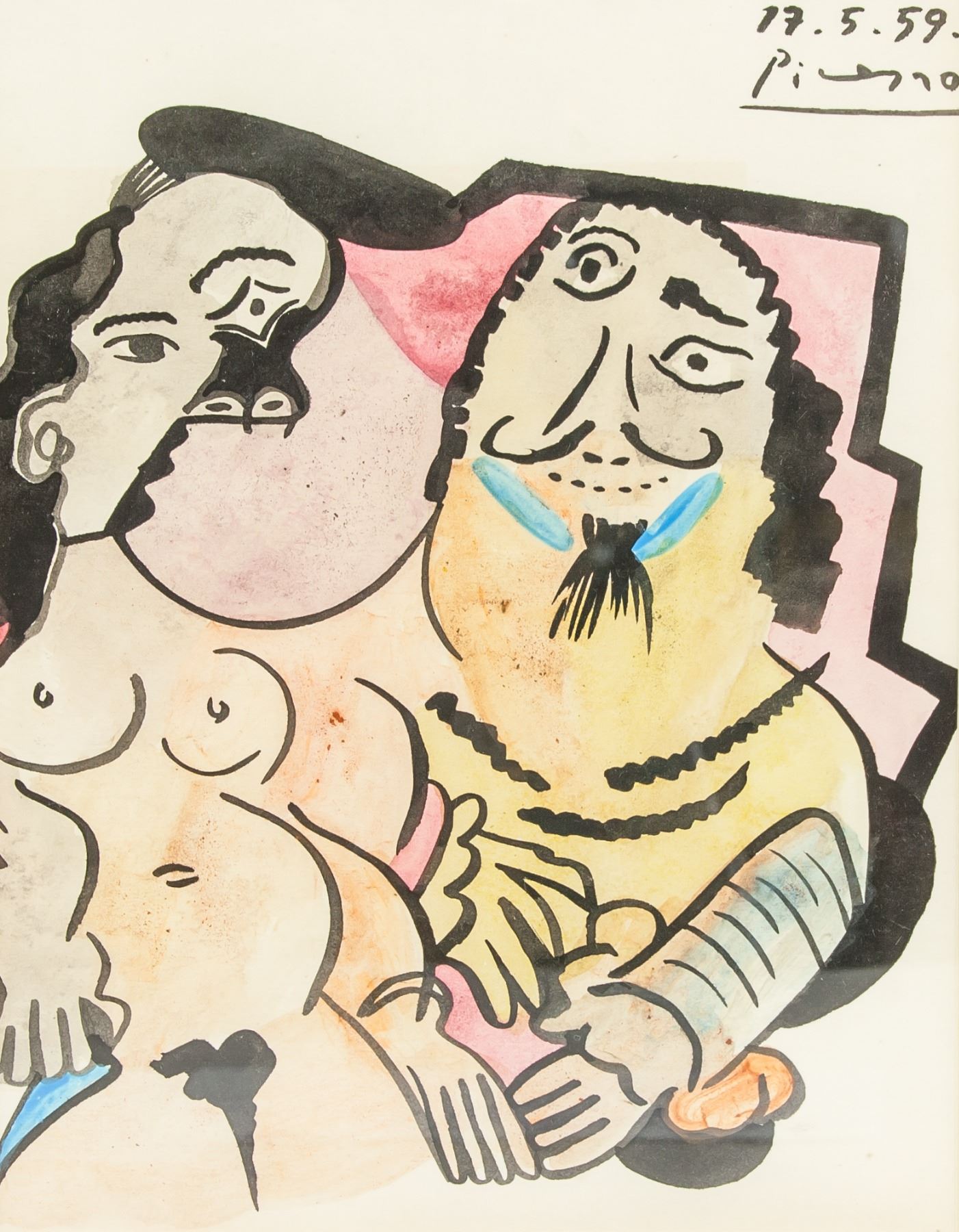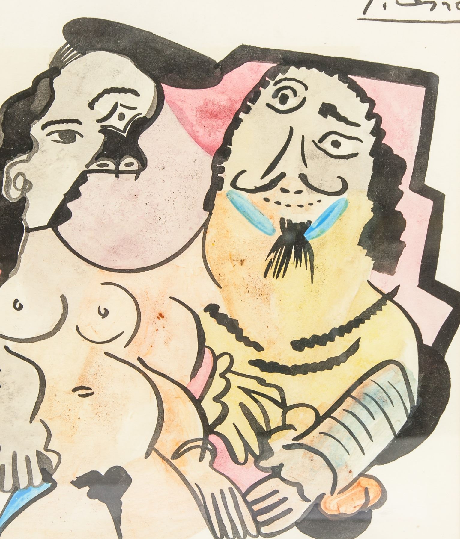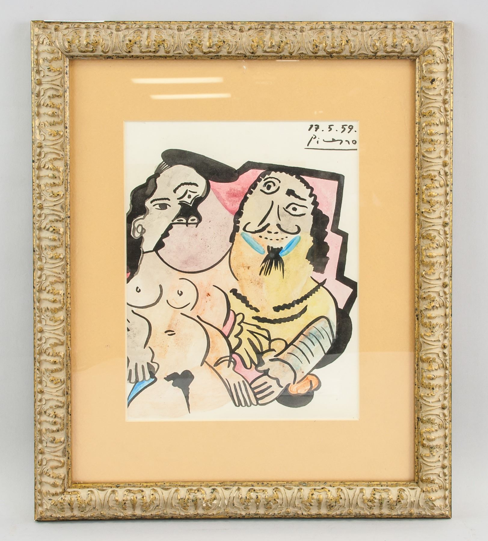 Watercolor on paper, featuring cubist man and woman. Signed and attr. to Pablo Picasso. Signature on upper right corner. A prolific and tireless innovator of art forms, Pablo Picasso impacted the course of 20th-century art with unparalleled magnitude. Inspired by African and Iberian art and developments in the world around him, Picasso contributed significantly to a number of artistic movements, notably Cubism, Surrealism, Neoclassicism, and Expressionism. Along with Georges Braque, Picasso is best known for pioneering Cubism in an attempt to reconcile three-dimensional space with the two-dimensional picture plane, once asking, “Are we to paint what’s on the face, what’s inside the face, or what’s behind it?†Responding to the Spanish Civil War, he painted his most famous work, Guernica (1937), whose violent images of anguished figures rendered in grisaille made it a definitive work of anti-war art. “Painting is not made to decorate apartments,†he said. “It’s an offensive and defensive weapon against the enemy.†Picasso’s sizable oeuvre includes over 20,000 paintings, prints, drawings, sculptures, ceramics, theater sets, and costume designs. PROVENANCE: Southern Ontario Estate. 8.75 x 7 in