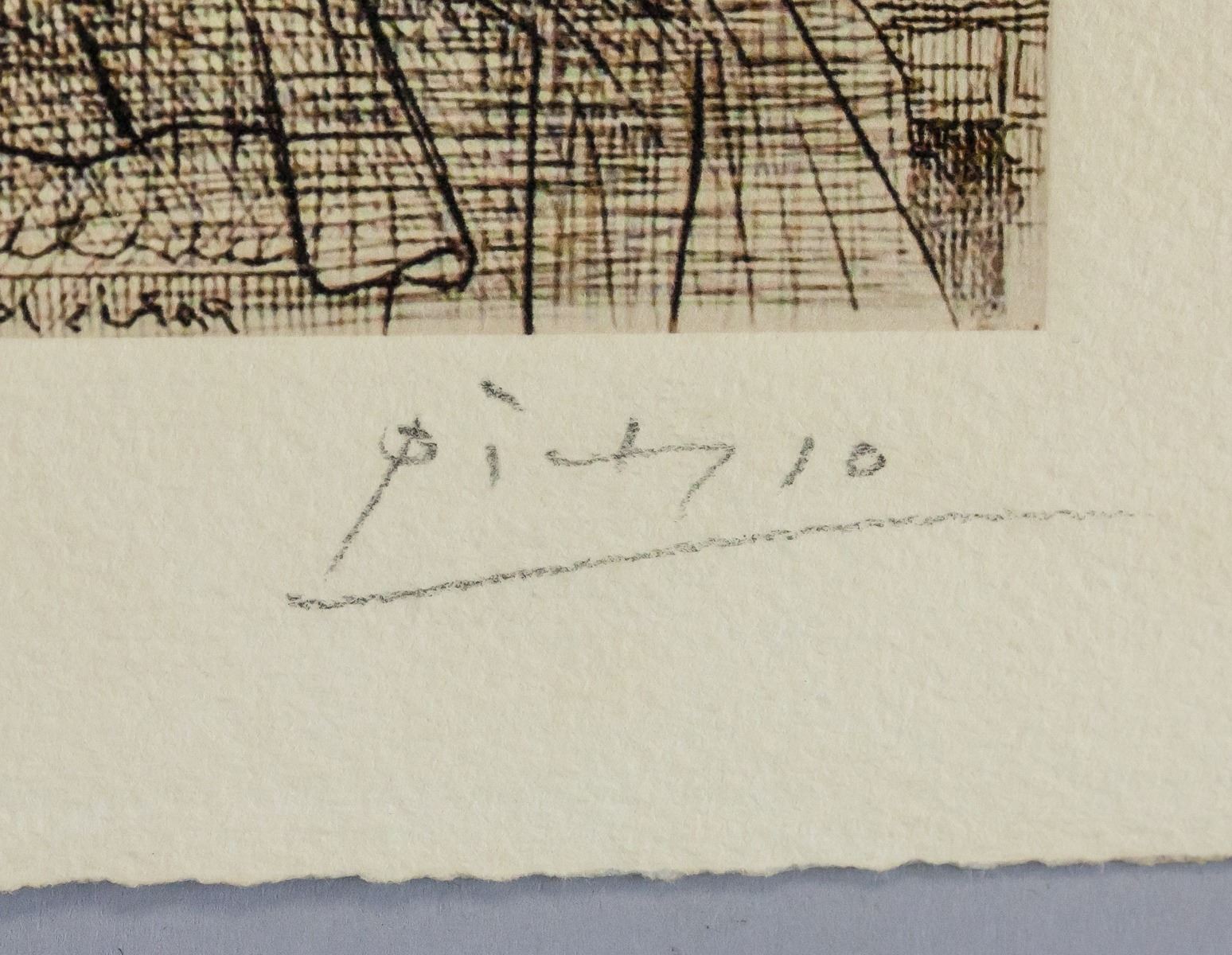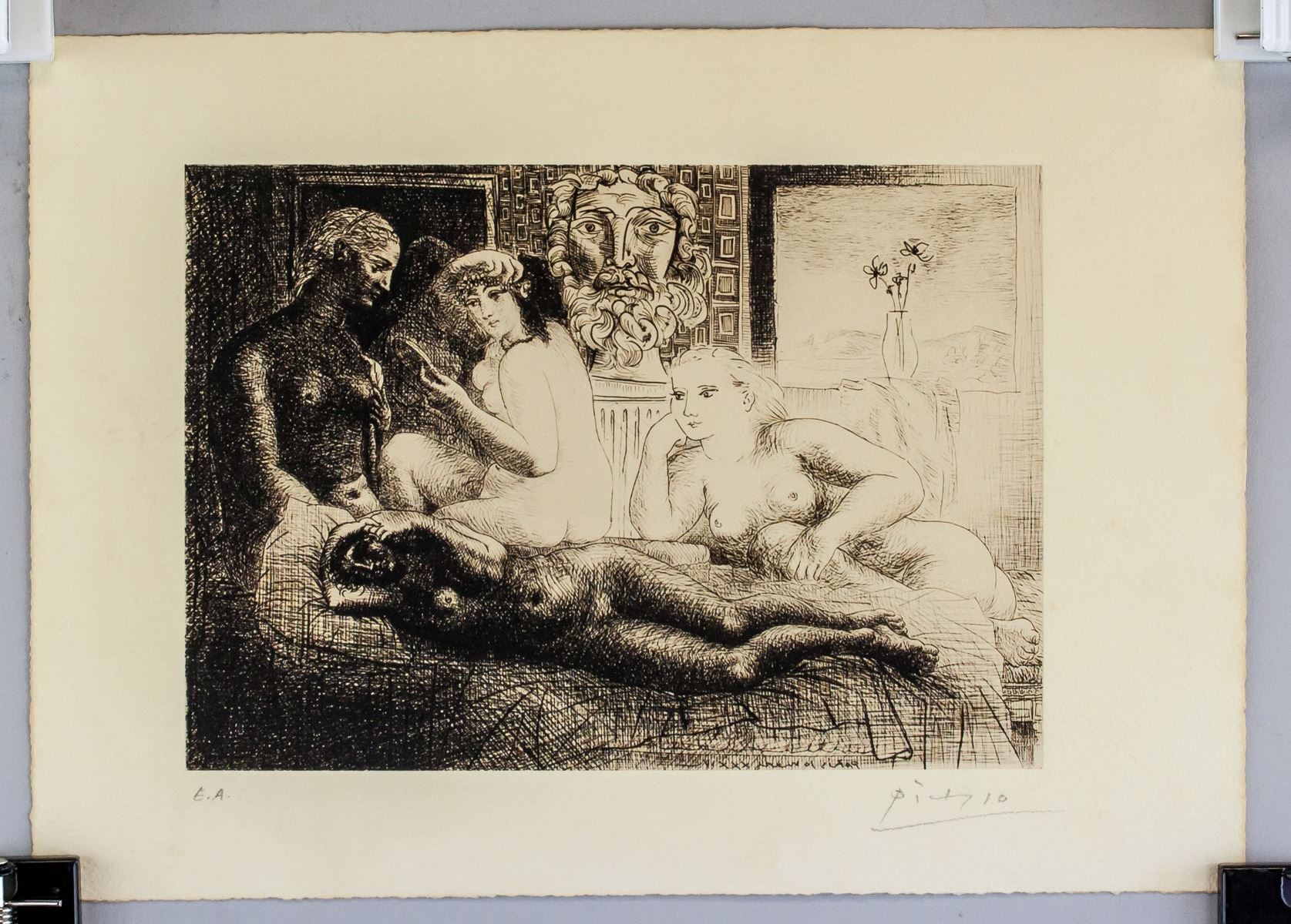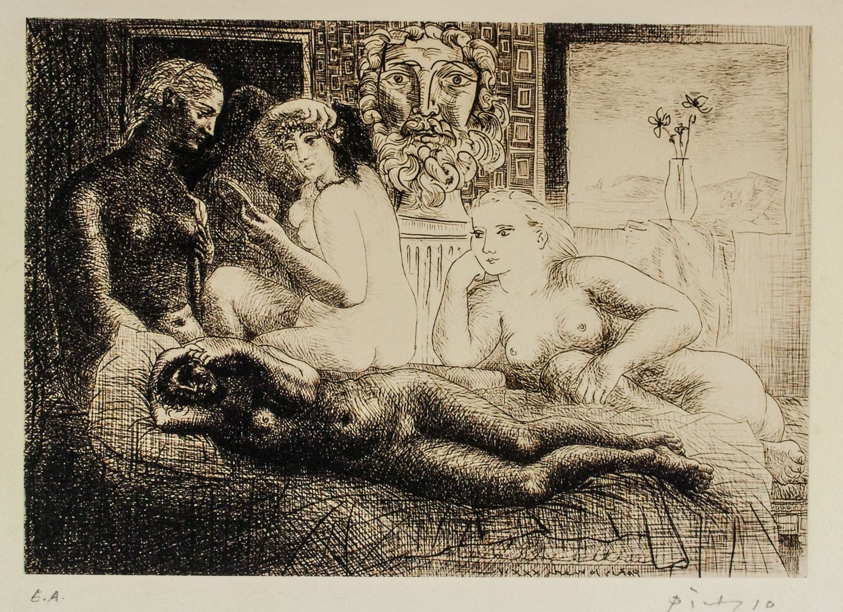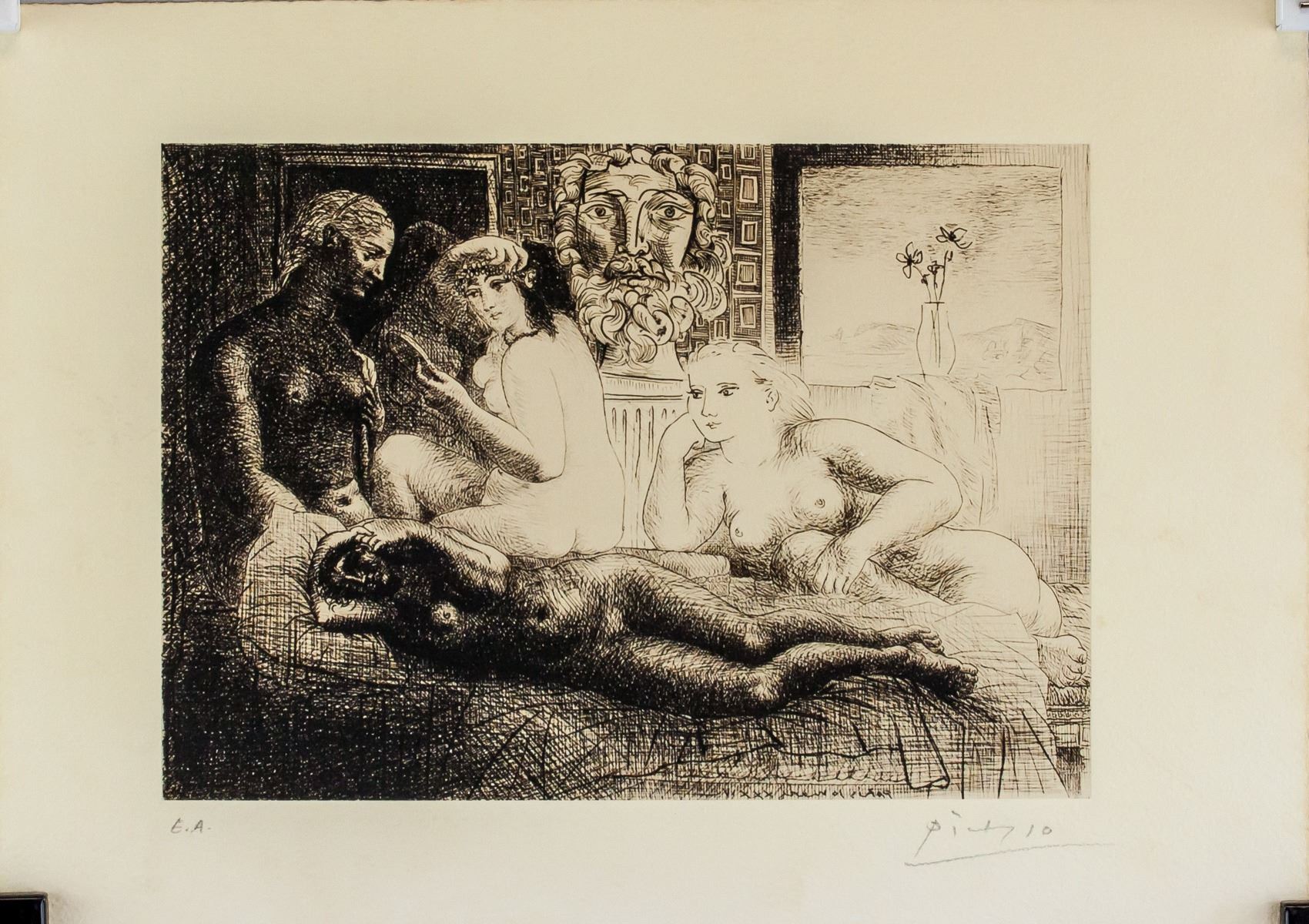 Linocut on paper. Featuring a portrait of several nude woman. Signed Picasso and inscribed E.A. on the lower right and lower left corner, respectively. Attributed to Pablo Picasso (1881-1973, Spanish). 21 x 30 cm (8.25 x 11.75 in). Provenance: This lot carries limited provenance from an Upper New York estate
