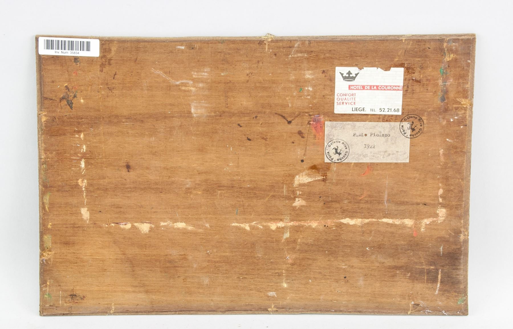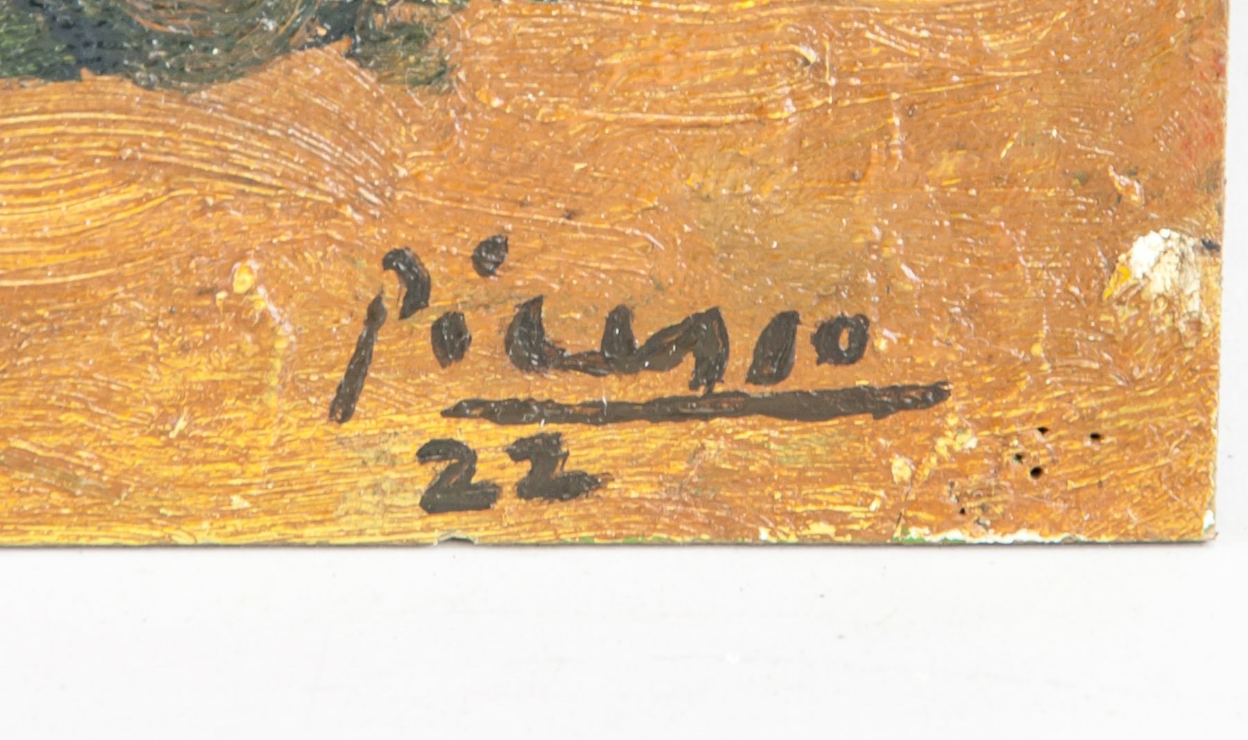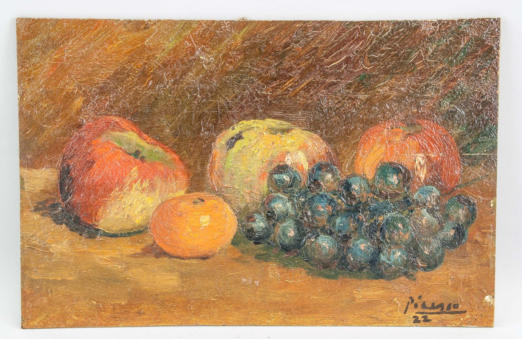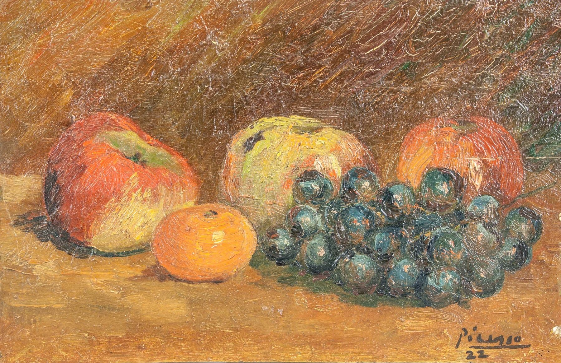 Oil on board. Featuring fruits still life scene. Signed Picasso and inscribed 22 on the lower right corner. Attributed to Pablo Picasso (Spanish 1881-1973). Stamped with seal inscribed HOTEL DE LA COURONNE and underneath another label inscribed Pablo Picasso 1922 with stamp Galerie Rive Gauche Paris on verso. 8.3 x 12.8 in. (21 x 32.5 cm). PROVENANCE: Private Collection (Manchester, UK)