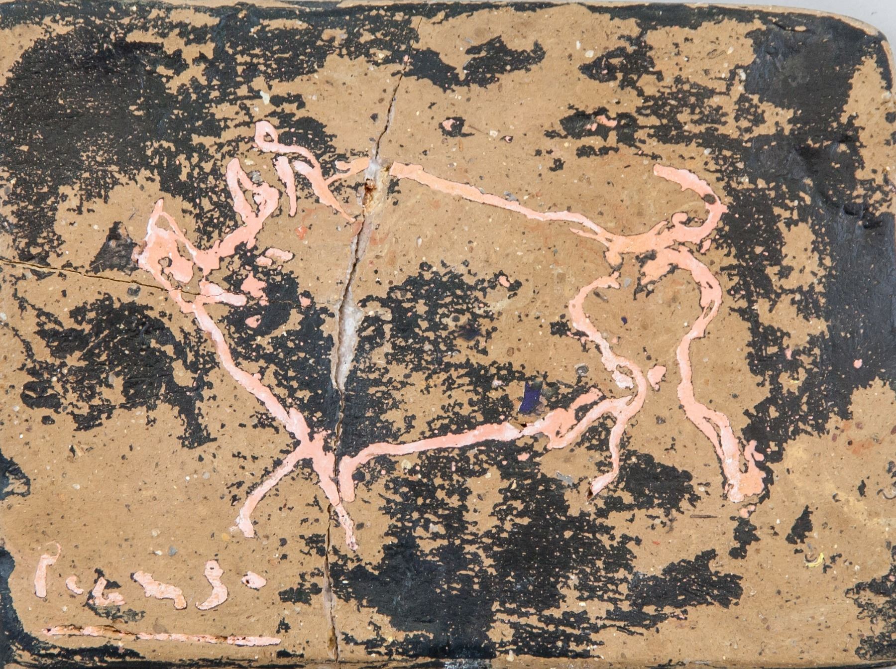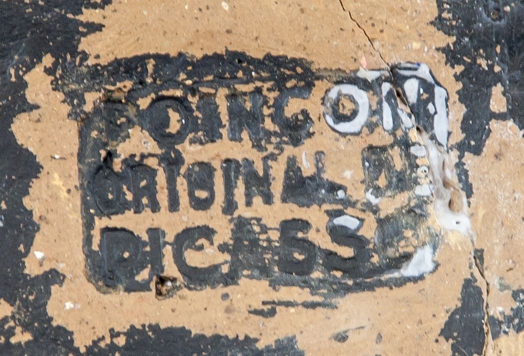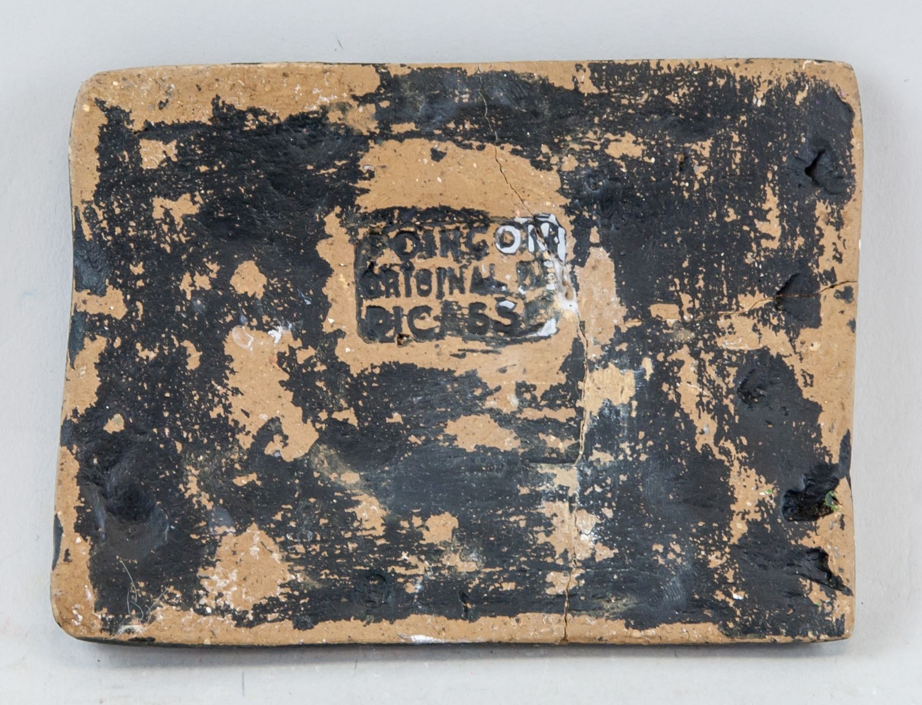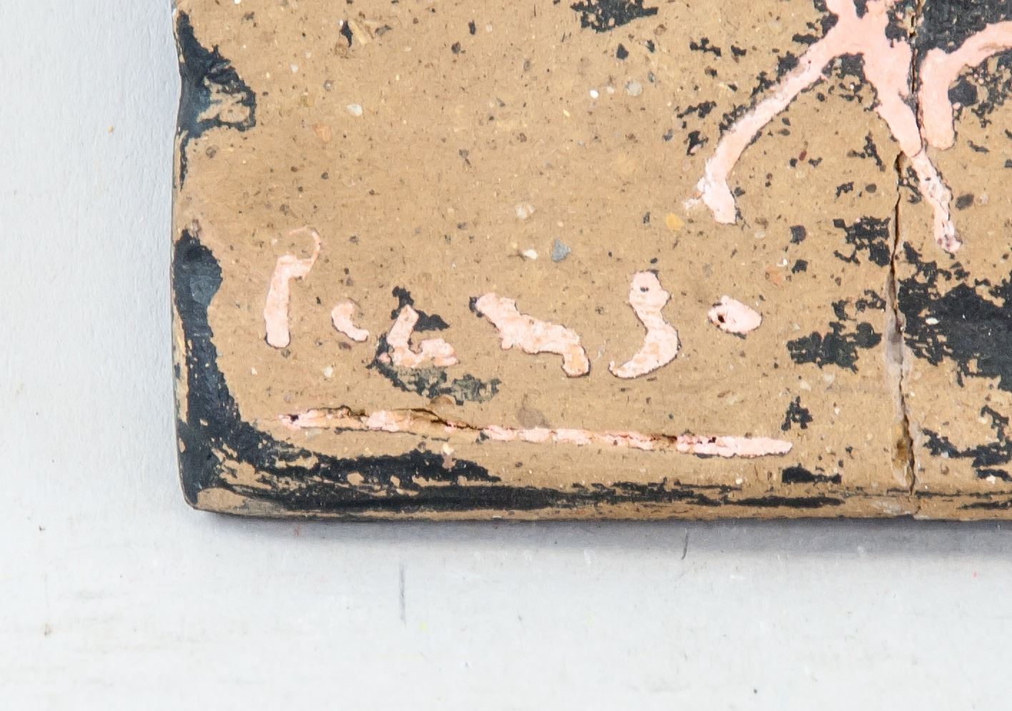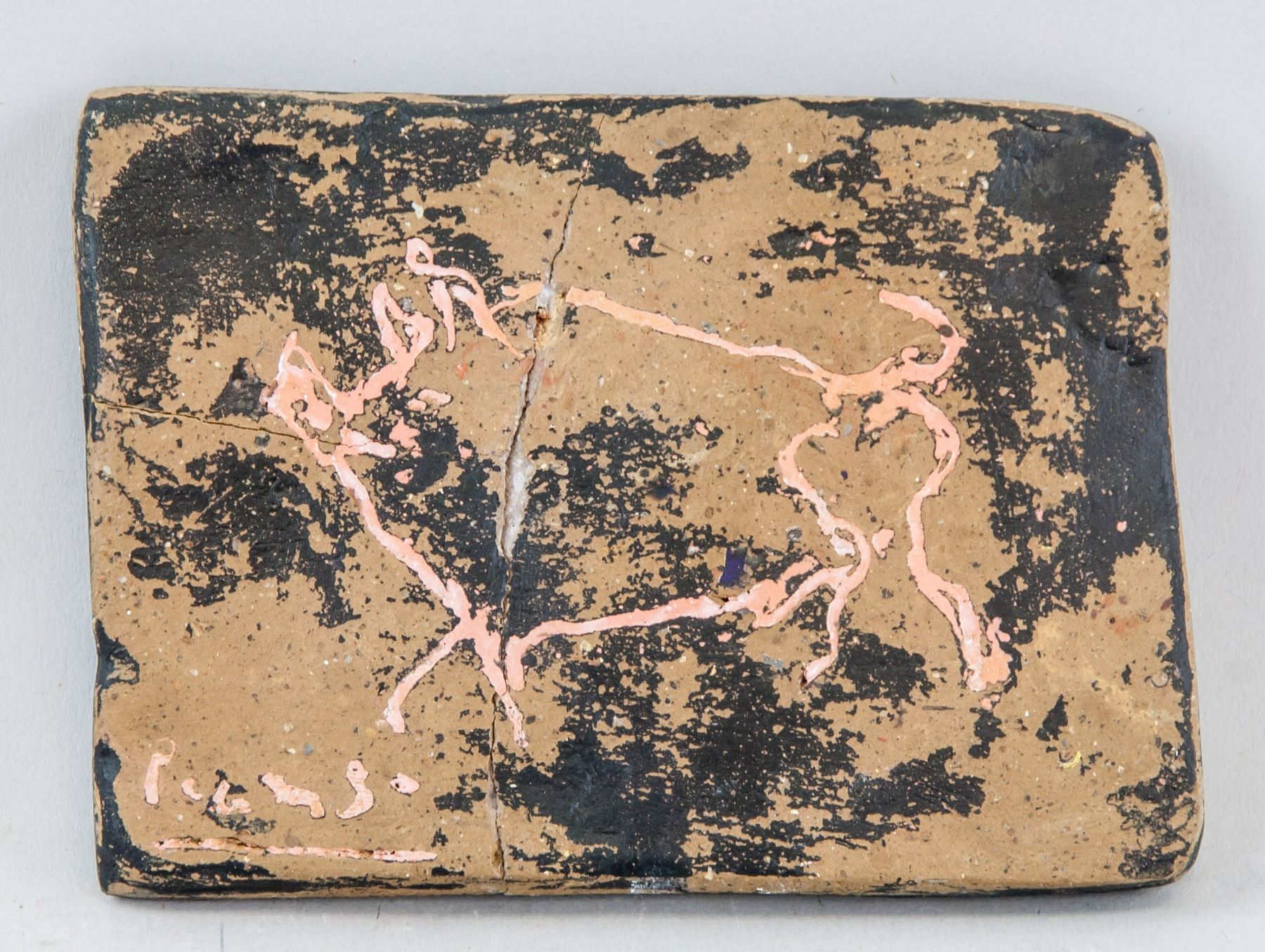 Clay tile, featuring a pig. Signed Picasso on the lower left corner. Verso with seal mark inscribed "POINCO ORIGINAL DE PICASSO." Attributed to Pablo Picasso (Spanish, 1881-1973). 8.5 x 12 x 1.8 cm (3.3 x 4.7 x 0.7 inches). PROVENANCE: Private collection (Central Europe)