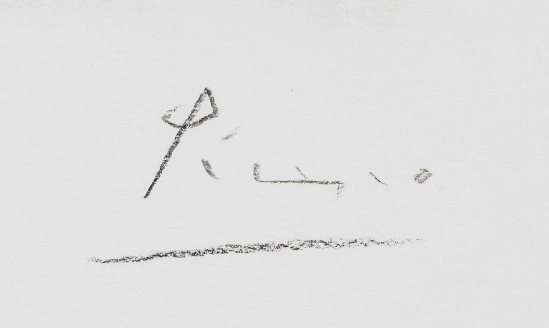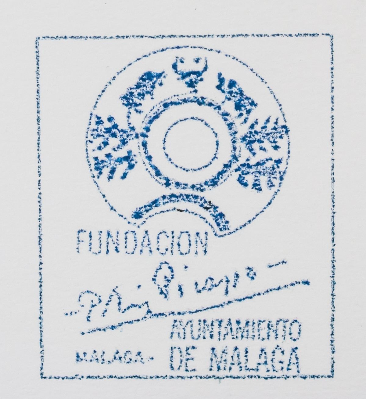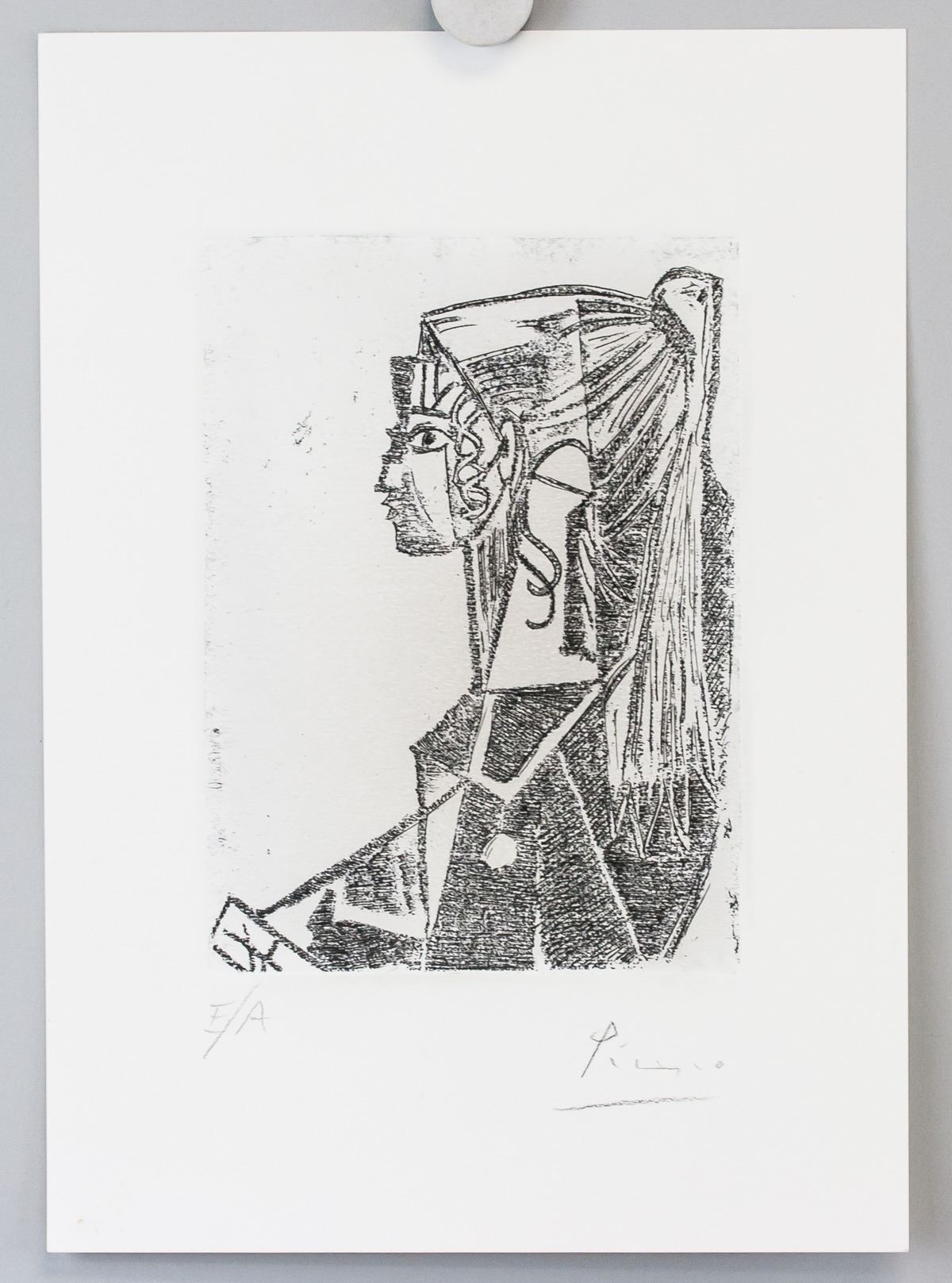 Lithograph on paper. Featuring side portrait of a woman. "E/A" inscribed to the bottom left of the image. Signed "Picasso" to the bottom right of the image. Stamp on verso reads "FUNDACION AYUNYAMENIO DE MALAGA". Attributed to Pablo Picasso (1881-1973, Spanish).