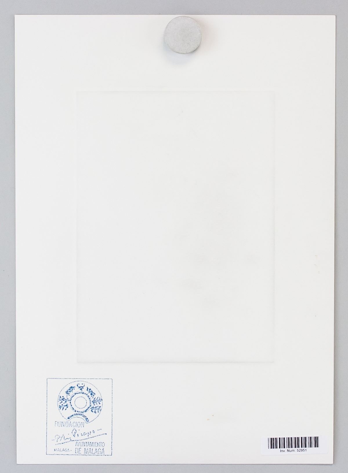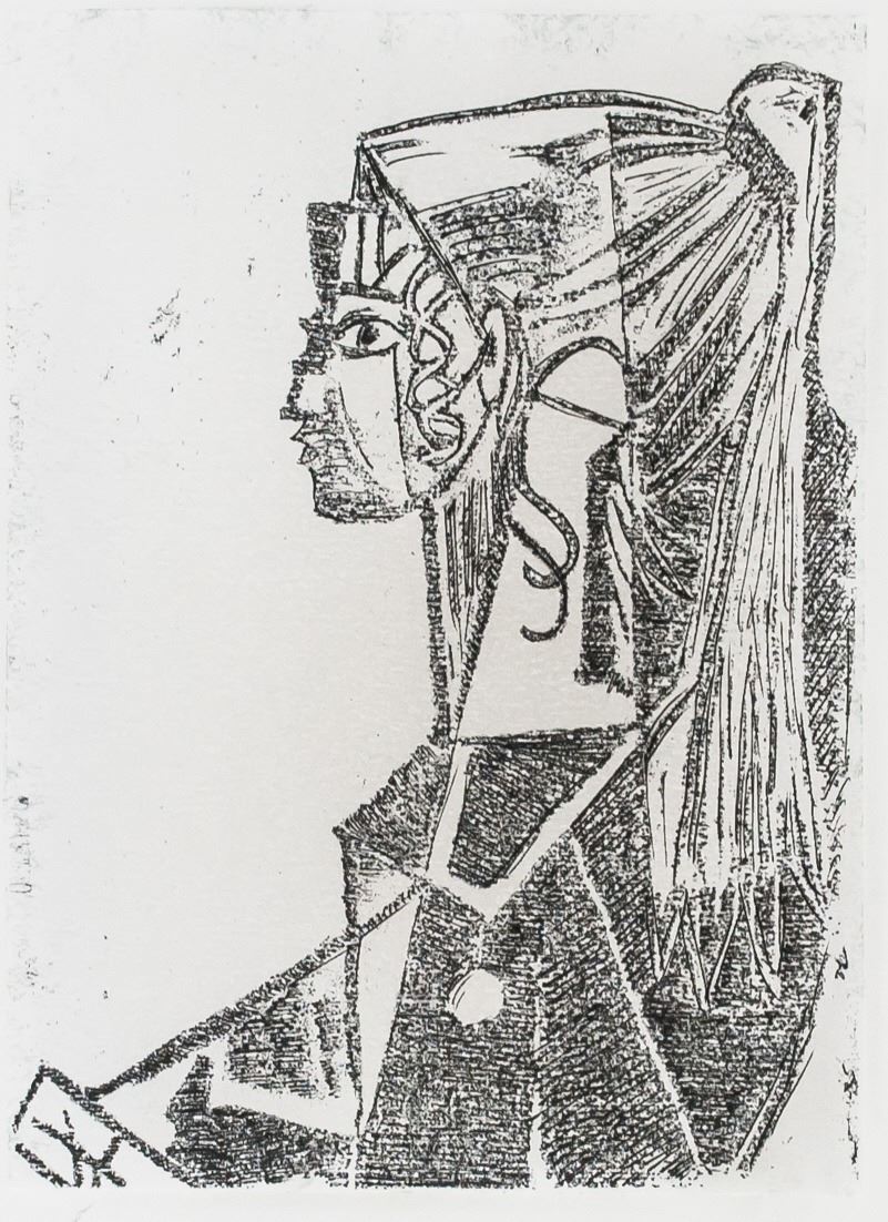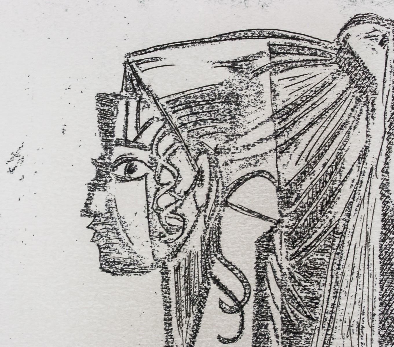 Lithograph on paper. Featuring side portrait of a woman. "E/A" inscribed to the bottom left of the image. Signed "Picasso" to the bottom right of the image. Stamp on verso reads "FUNDACION AYUNYAMENIO DE MALAGA". Attributed to Pablo Picasso (1881-1973, Spanish).