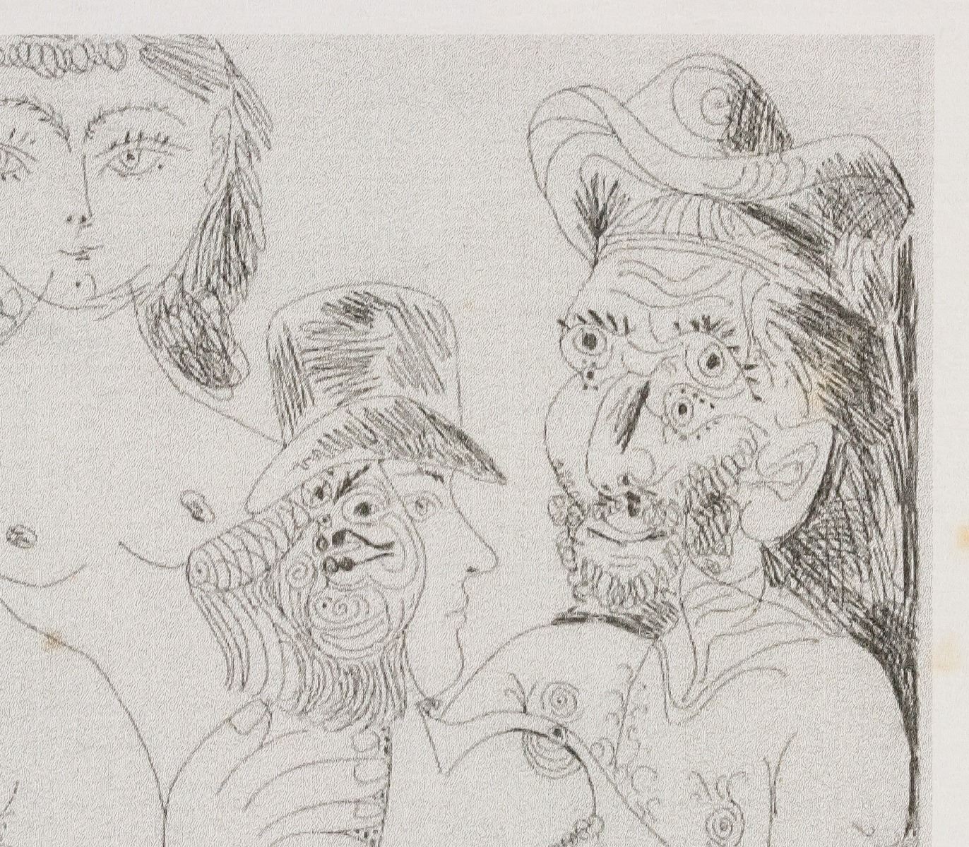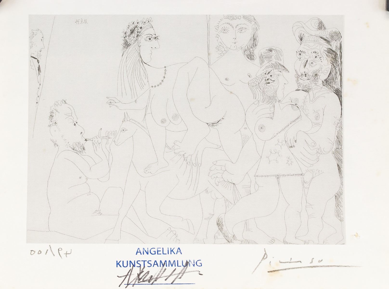 Lithograph on paper. Featuring cubist sketch of a group of nude figures. "001/49" inscribed backward in the bottom left corner. "Picasso" present in the bottom right corner. Stamp reading "ANGELIKA KUNSTSAMMLUNG" and signature present beneath image. "01.4.71" present in top left, also written in reverse. Attributed to Pablo Picasso (1881-1973, Spanish). 21 x 28 cm. PROVENANCE: This lot carries limited provenance from an Upper New York estate