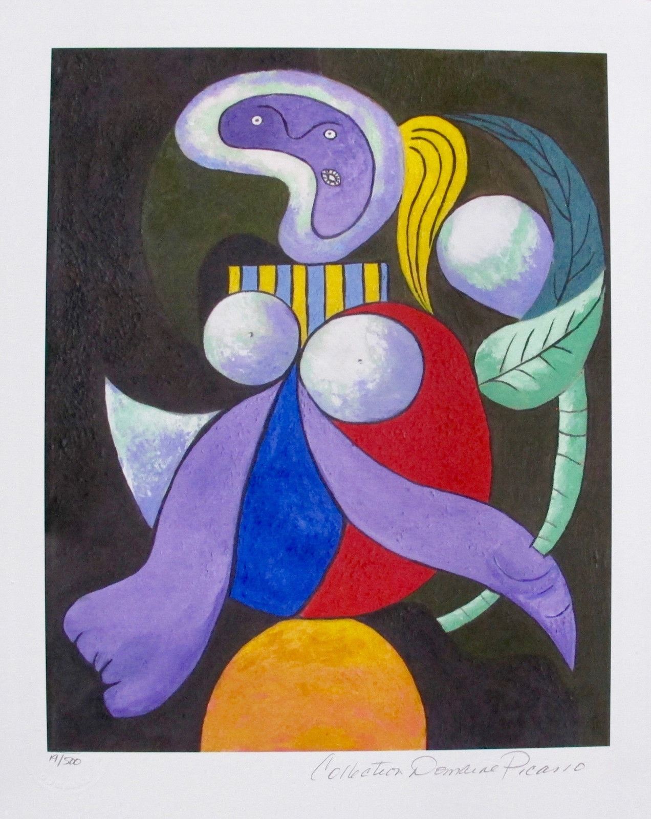 This is a PABLO PICASSO (ESTATE COLLECTION DOMAINE) (1881-1973) small giclee titled WOMEN WITH A FLOWER. This piece is pencil signed on the lower right as Collection Domaine Picasso and has an embossed seal stamped by the Picasso Estate. Pencil numbered from an edition of 500. Paper measures 14.5 inches x 11.5 inches. Image measures 12 inches x 9.5 inches. Prublished on thick quality archival paper. In mint condition, comes unframed. Comes with a certificate from the Picasso Domaine Collection.