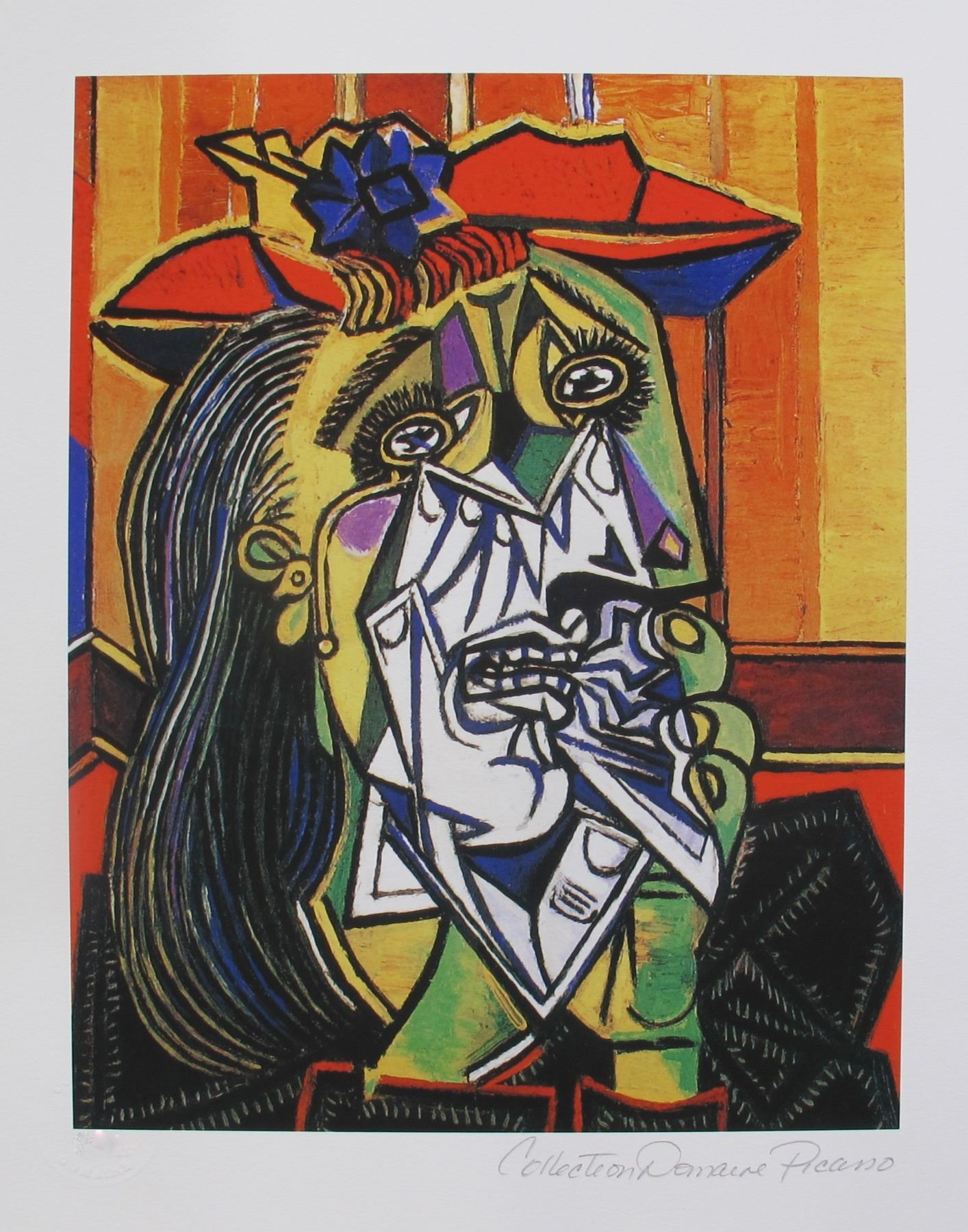 PABLO PICASSO (ESTATE COLLECTION DOMAINE) (1881-1973) small giclee titled “WEEPING WOMAN WITH HAT”. This piece is pencil signed on the lower right as ‘Collection Domaine Picasso’ and has an embossed seal stamped by the Picasso Estate. Pencil numbered from an edition of 500. Paper measures 15? x 11.5?. Image measures 12? x 9.5?. Made on thick quality archival paper. In excellent condition, comes unframed. Comes with a certificate from the Picasso Domaine Collection.