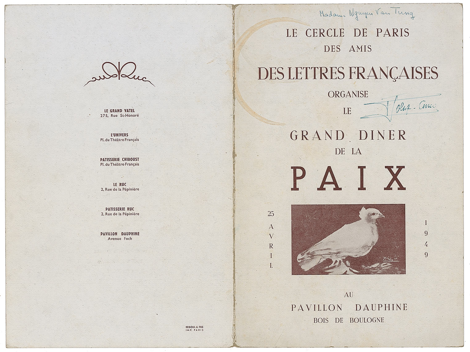 Menu from the Big Dinner For Peace, held in Paris on April 25, 1949, 6.25 x 9.5 closed, signed inside in ink, “Picasso,” and signed twice by Pablo Neruda, “Neruda.” Menu is also signed by 10 others, including Joliot-Curie (who has signed again on the front cover), Elsa Triolet, Aragon, and Jean Effel, who adds a small sketch. In fine condition, with toning and soiling to covers, and collector’s notations opposite signed page. This Dinner for Peace was organized by the Paris Club of Friends of French Literature at the Pavillon Dauphine in 1949. A scarce combination of two masters coming together for a common cause.