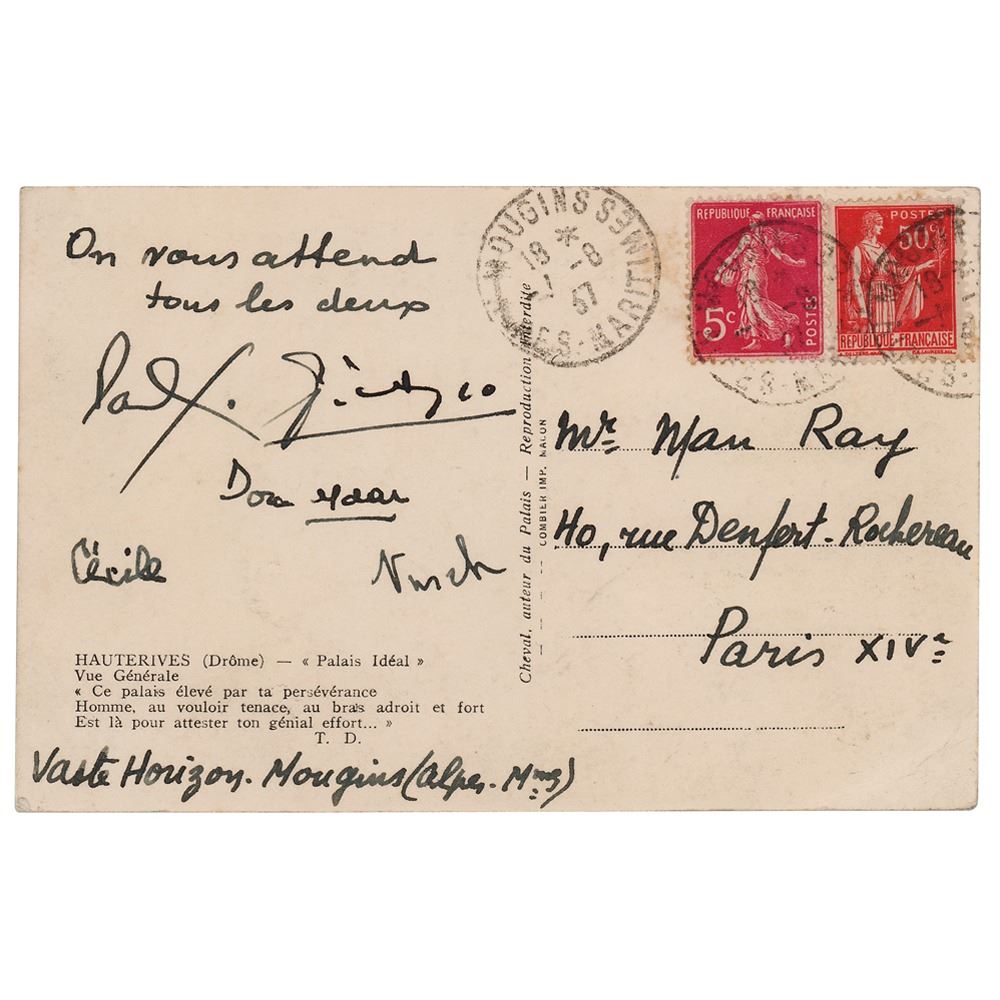 Rare 5.5 x 3.5 postcard of the famed Le Palais Idéal in Hauterives, built by French postman Ferdinand Cheval over the course of thirty-plus years, signed on the reverse in ink by the great Cubist painter Pablo Picasso, Surrealist poet Paul Éluard, model and Surrealist artist Nusch Éluard, their daughter Cécile Eluard, and photographer Dora Maar. Addressed to the important Dada/Surrealist photographer Man Ray at his studio, "40 rue Denfert Rochereau, Paris." Annotated along the bottom edge, "Vaste Horizons, Mougins (Alpes Mmes)," and postmarked at Mougins, Alpes-Maritimes on May 18, 1937. In fine condition.
