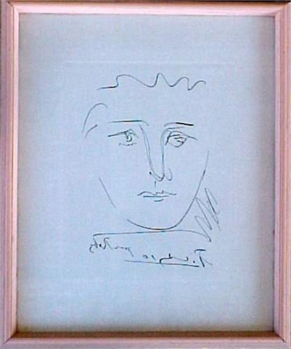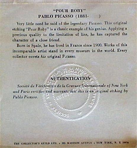 Pablo Picasso etching "Pour Ruby"; plate signed on bottom; with letter of authentication on reverse; image measures 13 1/2" x 9 1/2"; framed (no visible defects)