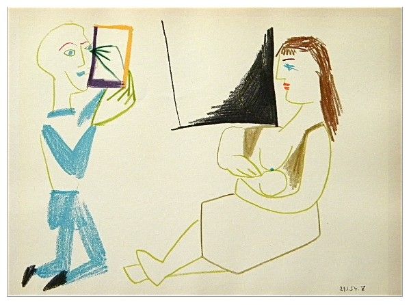 Pablo Picasso lithograph (Woman and Clown) - Medium: lithograph (after the drawing). This lithograph is from the "Suite de 180 Dessins de Picasso" portfolio (Verve issue No. 29-30), published in Paris in 1954 by Teriade. The drawing is taken from one of Picasso's private sketchbooks and the lithography was done by the celebrated Mourlot Frères, of Paris. Sheet size: 10 1/4 x 14 inches (260 x 350 mm) - Professionally Framed & Matted - Comes With Certificate - -