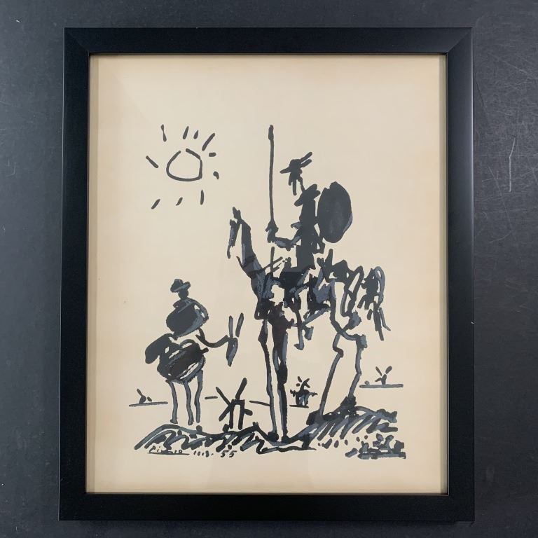 Pablo Picasso's "Don Quixote" framed print on paper. Don Quixote is a 1955 sketch by Pablo Picasso of the Spanish literary hero and his sidekick, Sancho Panza. It was featured on the August 18–24 issue of the French weekly journal Les Lettres Françaises in celebration of the 350th anniversary of the first part, published in 1605, of the Miguel de Cervantes novel Don Quixote. Made on August 10, 1955, the drawing Don Quixote was in a very different style than Picasso's earlier Blue, Rose, and Cubist periods. This piece is framed and in good condition.