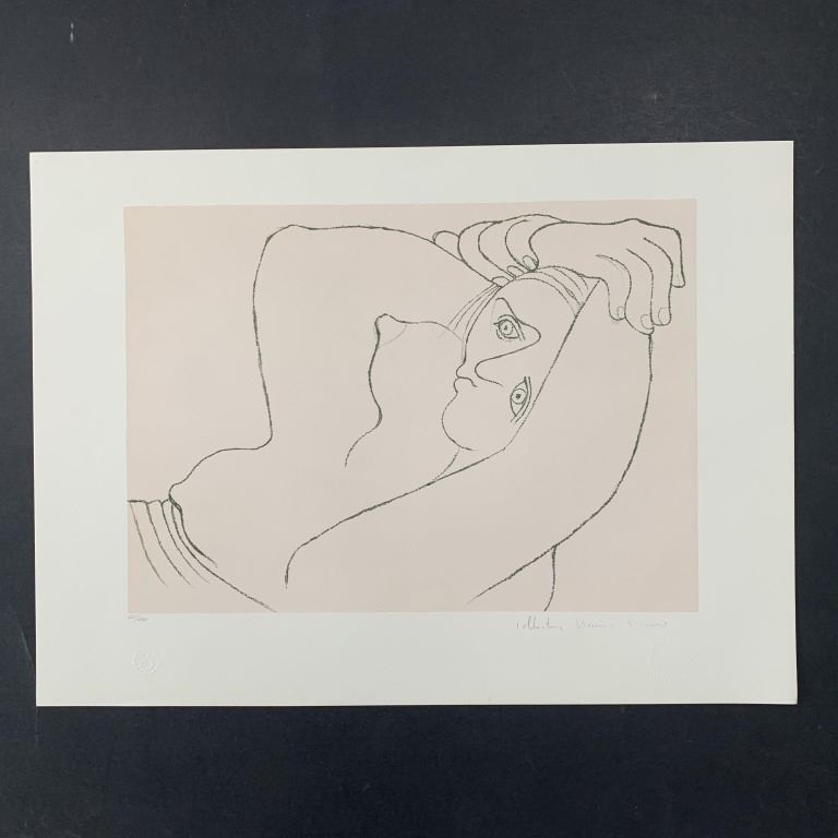 Pablo Picasso's "Femme Couchee" limited edition print on Arches paper, signed by Marina Picasso lower right and numbered 207/500 lower left. In excellent condition.