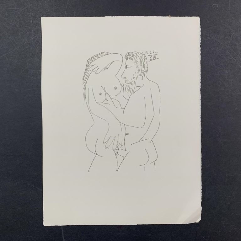 Pablo Picasso's "Le Gout de Bonheur 8.10.64. XIV" limited edition print. This piece is of an aroused nude man, embracing a nude woman, holding her breasts. This piece is in great condition, with a minor crease lower right and a minor small crease lower right corner.