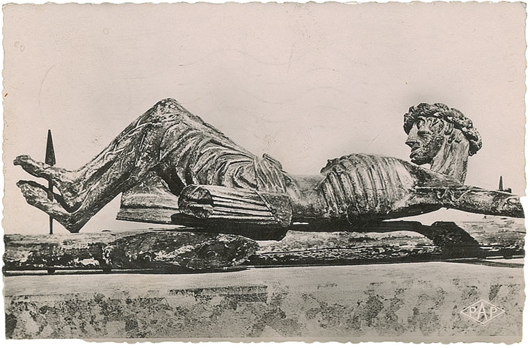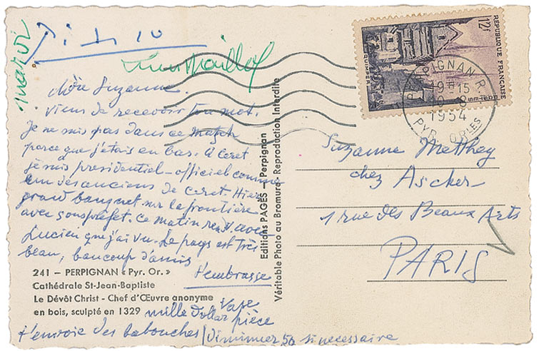 Ink signature, “Picasso,” on the correspondence side of a 5.25 x 3.5 postcard bearing an image of Le Devot Christ. Postcard bears a letter in an unknown hand, in French, and postmarked August 10, 1954. Some mild toning and soiling, postal cancellation lightly affecting a few words of text, and light silvering and postal impressions to image side, otherwise fine condition.