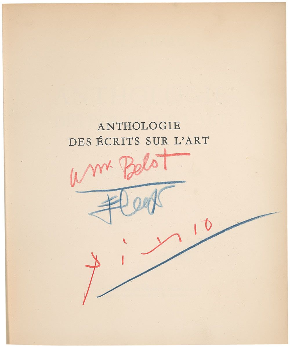 Three-volume set Paul Eluard, Anthologie des Écrits sur L’Art (Paris: Éditions Cercle d’Art, 1953), all measuring 8.75 x 10.5, signed in blue and red crayon on the half-title page of Volume II, “Picasso,” and also signed and inscribed “a Mr. Bletot, F. Leger.” In fine condition, with small tape stains with show-through on front and back free-end papers not affecting the signed page, tape stains and remnants to pastedowns of Volume I, similar tape stains to Volume III, as well as a split front hinge, and mild sunning to spines.