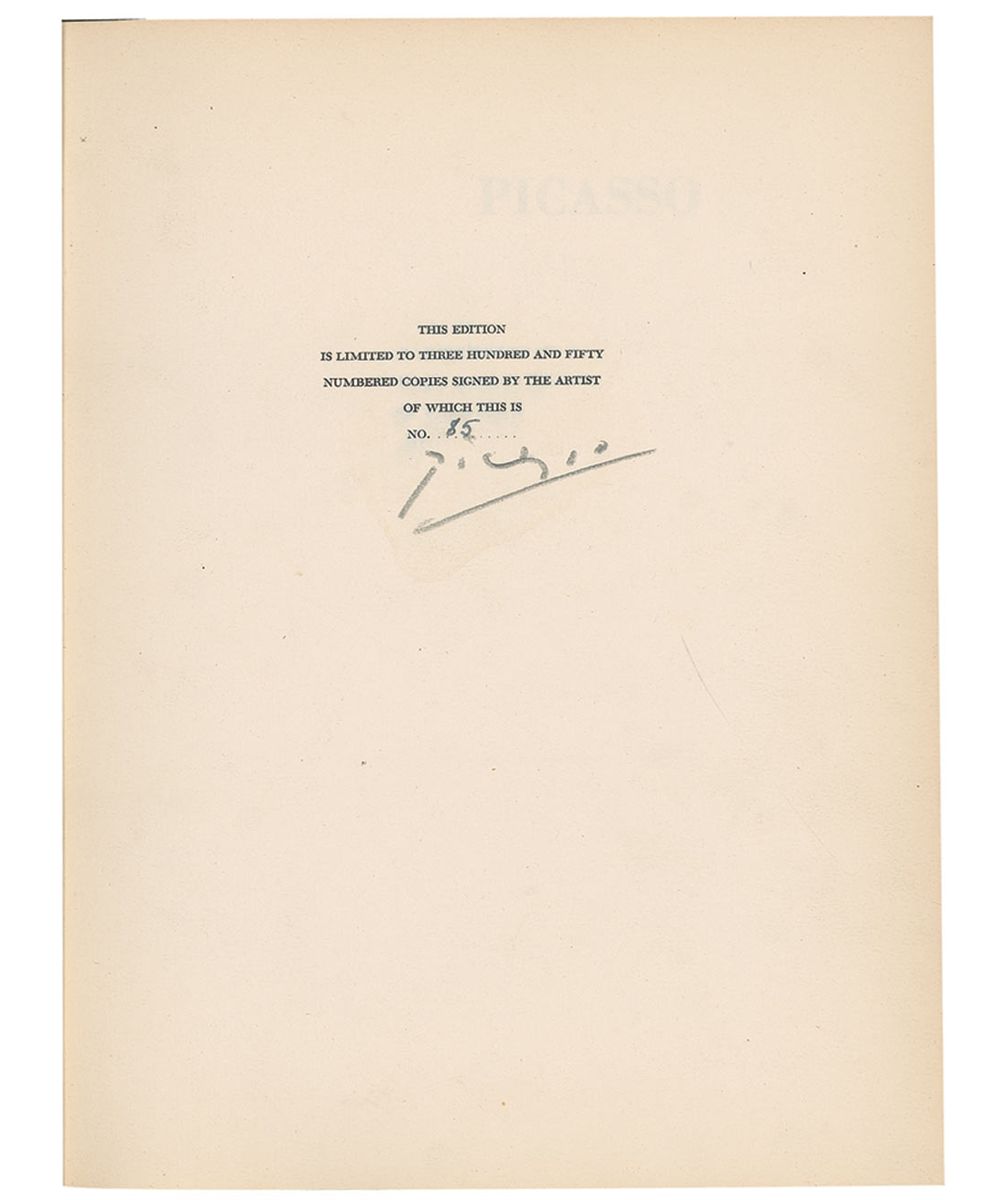 Signed book: Picasso: The Recent Years 1939–1946. Limited edition of 350 copies (This being No. 85). NY: Doubleday, 1947. Hardcover, 8.75 x 11, 211 pages. Signed in pencil on the limitations page, “Picasso.” Mild dampstaining over signature and some mild toning to opening and closing pages, otherwise fine condition.