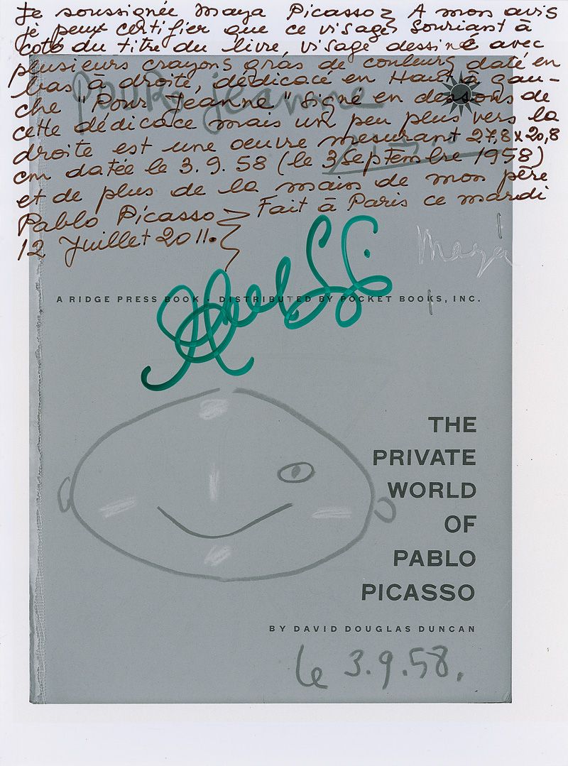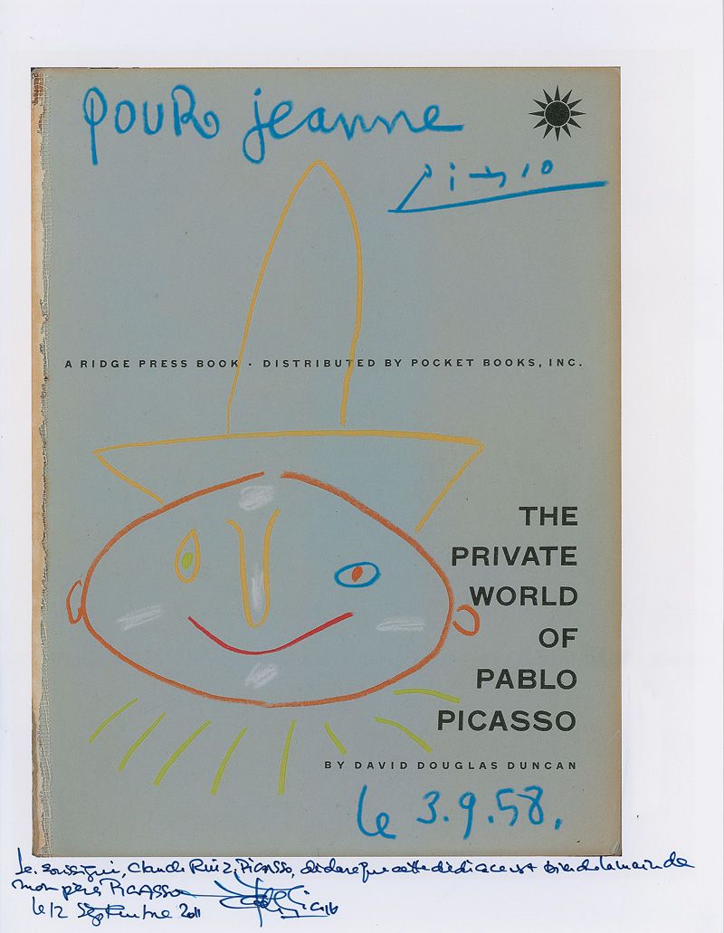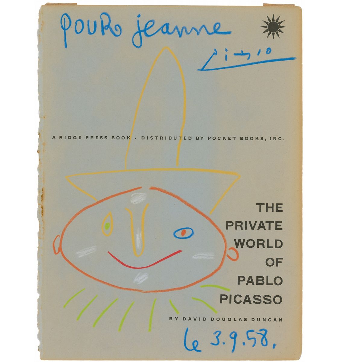 Exceptional and vibrant color original vintage signed and inscribed oil pastel sketch of a clown in a hat on an off-white 8.25 x 11 title page from a copy of The Private World of Pablo Picasso, signed and inscribed “Pour Jeanne, Picasso le 3.9.58.” In fine condition, with a rough left edge and mild toning to edges. Accompanied by two letters of provenance, one from Charles Ruiz Picasso reads, (translated): “I undersigned, Charles Ruiz Picasso asserts that this dedication is from my father’s own hand.” The second, from Maya Picasso reads, (translated): “I undersigned Maya Picasso. According to me I can certify that the smiling face next to the book’s title, face drawn with several colored crayons dated at the bottom right, dedicated on top left ‘For Jeanne.’ Signed underneath this dedication but a little more to the right is a work measuring 27.8 x 20.8 cm dated 9-3-58 (September 3, 1958) is in addition from my father’s own hand Pablo Picasso. Paris, this Tuesday July 12, 2011.”