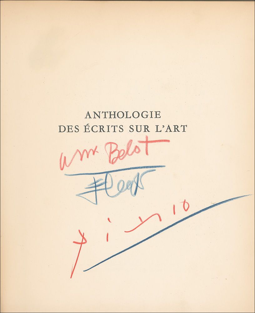 Signed book: Anthologie des Ecrits Sur l'Art, three volumes. Paris: Editions Cercle d'Art, 1953. Hardcover, 9 x 10.25, 168 pages. Signed on the half-title page of the second volume in red pencil, “Picasso,” and also signed and inscribed “a Mr. Bletot, F. Leger.” Autographic condition: fine. Book condition: VG-/None. Orange cloth-covered boards; light wear to edges with tiny tears in cloth at corners/spine-ends and –edges; spine sunned; slightly soiled; very slightly shaken; textblock edges darkened; two small areas of discoloration to each fep. In protective mylar sleeve. Volumes 1 and 3 in comparable condition.