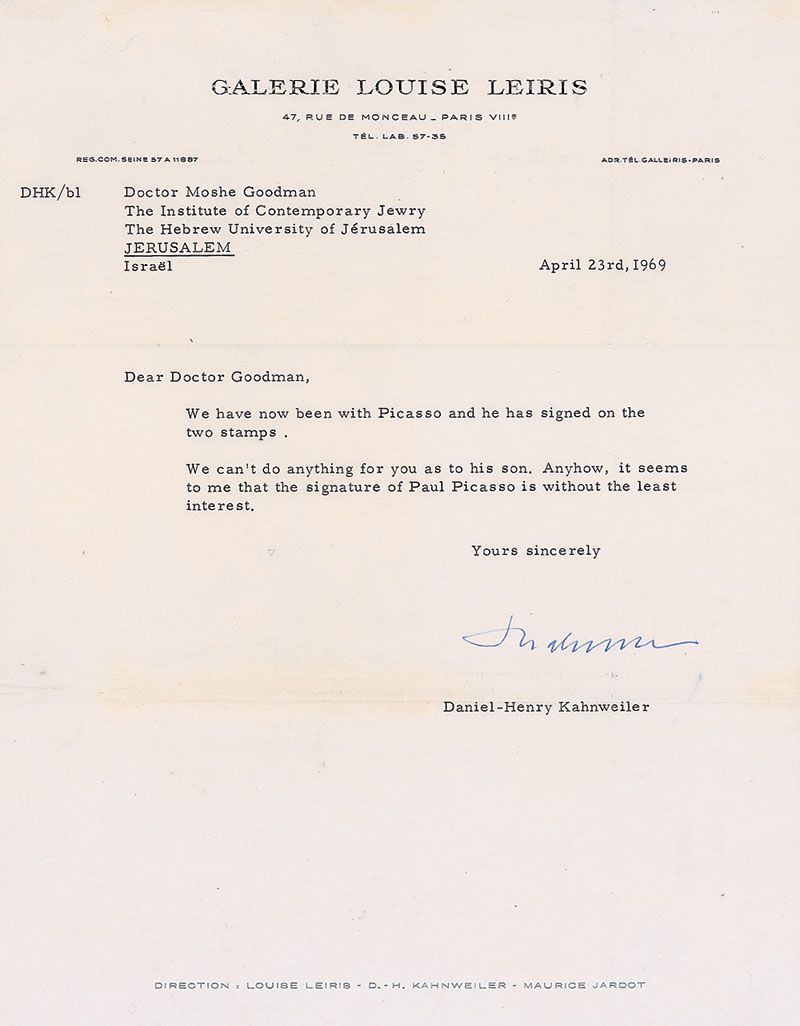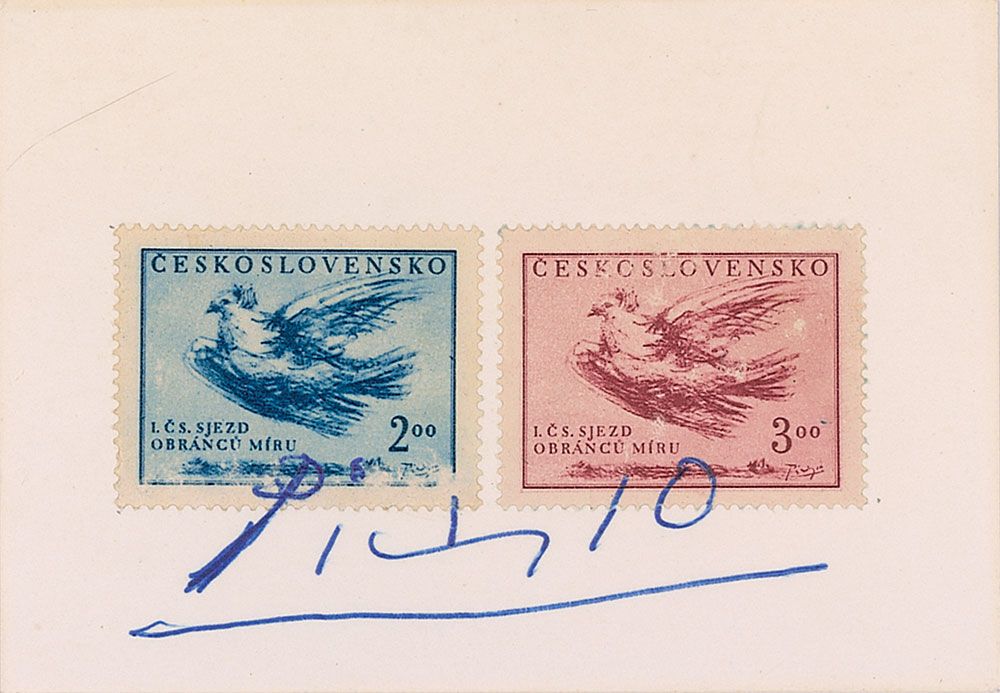 Two Czech postage stamps affixed to an off-white 3.75 x 2.5 card, signed at the bottom in blue ballpoint, “Picasso.” In fine condition. Accompanied by a letter of transmittal from the Galerie Louise Leiris in Paris, dated April 23, 1969, in part: “We have now been with Picasso and he has signed on the two stamps.”