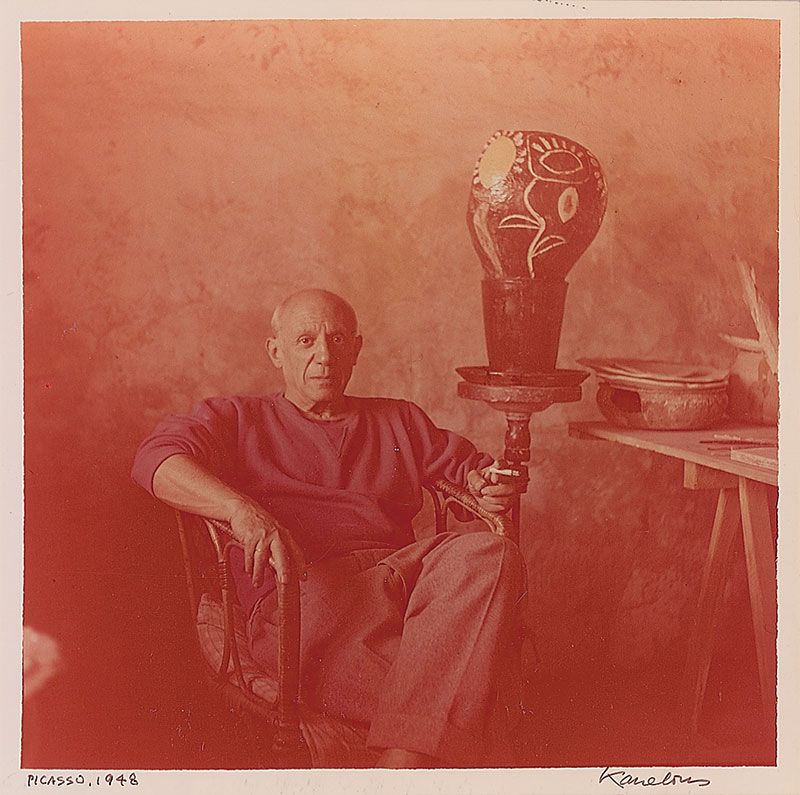 Color satin-finish 8.5 x 8.5 photo of Picasso sitting in a chair in his studio, a cigarette in his left hand, signed in the lower border in black ink by the photographer John Kanelous, who also notates the photo, “Picasso, 1948.” In fine condition, with a few scattered light surface marks and light overall fading to image.