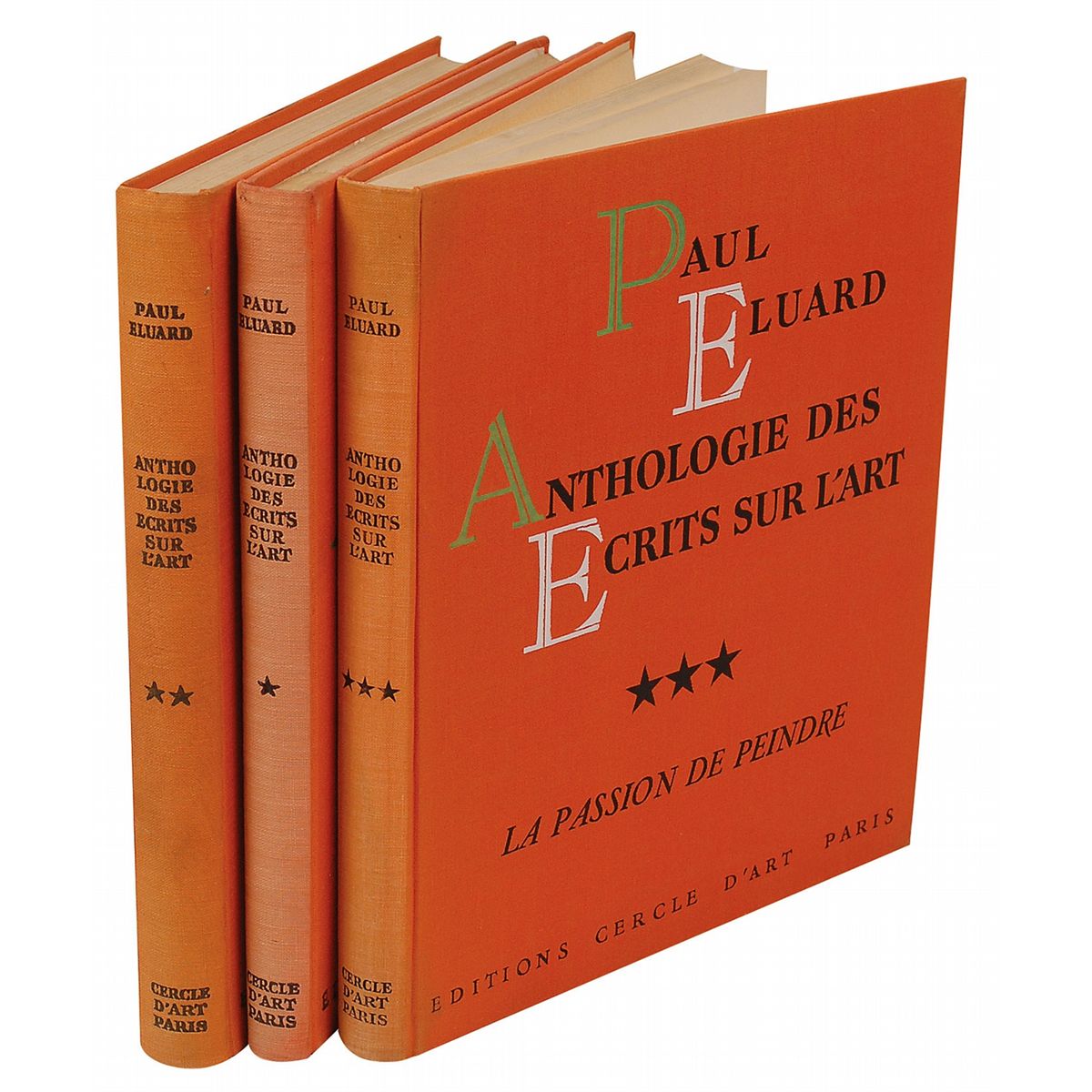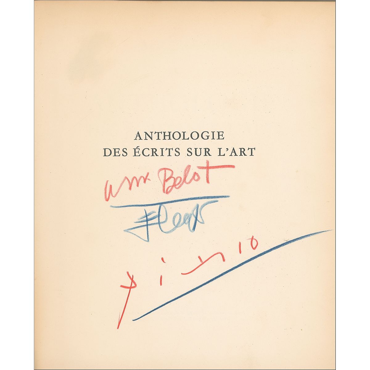 Signed book: Anthologie des Ecrits Sur l'Art, three-volumes. Paris: Editions Cercle d'Art, 1953. Hardcover, 9 x 10.25, 168 pages. Signed on the half-title page of the second volume in red pencil, “Picasso,” and also signed and inscribed “a Mr. Belot, F. Leger.” The recipient might possibly be the painter, illustrator, and printmaker Gabriel Belot. Autographic condition: fine. Book condition: VG-/None. Orange cloth-covered boards; light wear to edges with tiny tears in cloth at corners/spine-ends and –edges; spine sunned; slightly soiled; very slightly shaken; textblock edges darkened; two small areas of discoloration to each fep. In protective mylar sleeve. Volumes 1 and 3 in comparable condition.