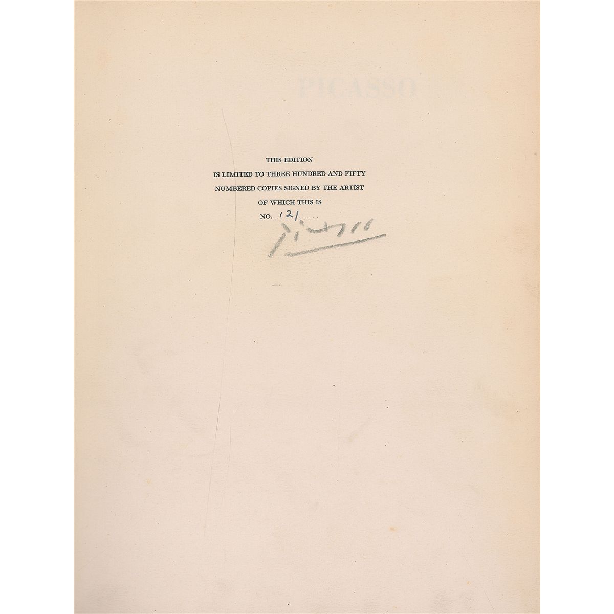 Signed book: Picasso: The Recent Years 1939–1946. Limited edition of 350 copies (this being No. 121). NY: Doubleday, 1947. Hardcover, 8.75 x 11, 211 pages. Signed in pencil on the colophon, “Picasso.” Autographic condition: fine, with a bit of scattered light toning and soiling to signed page. Book condition: VG-/None. Accompanied by an edition of Cashiers D’Art entitled Picasso 1930–1935.