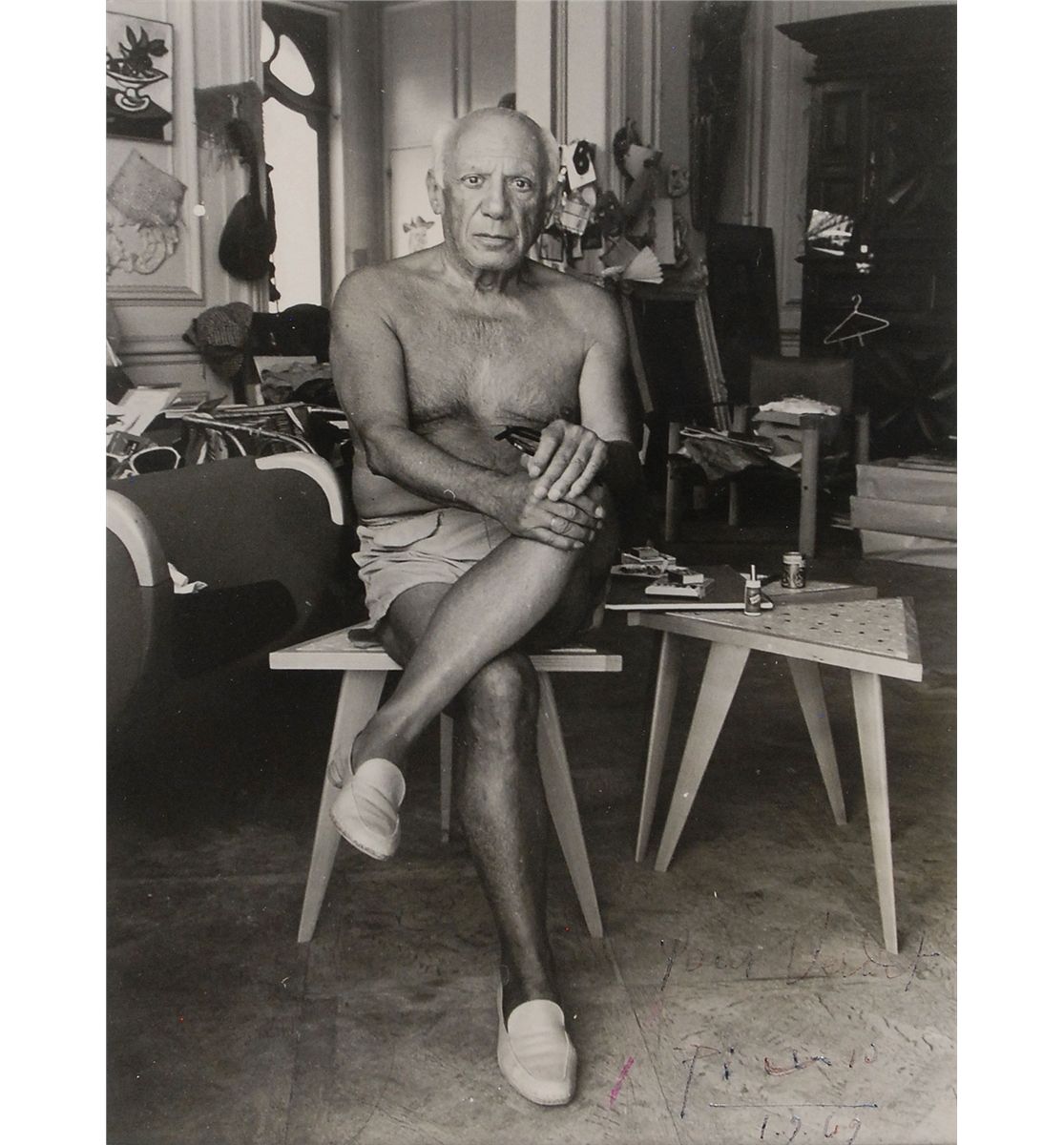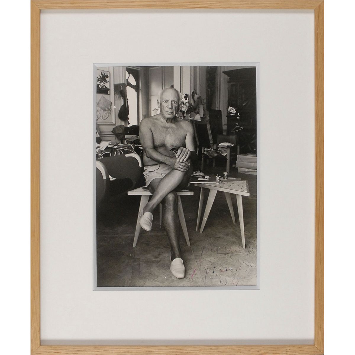 Crystal-clear vintage glossy 6.75 x 9.25 photo of Picasso shirtless and lounging with art materials by his side, signed and inscribed in the lower right in ink, “Pour Verdet, Picasso, 1.9.69.” Attractively matted and framed to an overall size of 12 x 14.75. Skipping and irregular adhesion to ink, and signature and inscription a few shades light, otherwise fine condition. The original recipient was Andre Verdet (1913–2004), a French poet, painter, and sculptor who counted Picasso—and other such luminaries including Chagall, Cocteau, Miro, and Leger—as one of his friends. A great pose in an uncommonly large size.