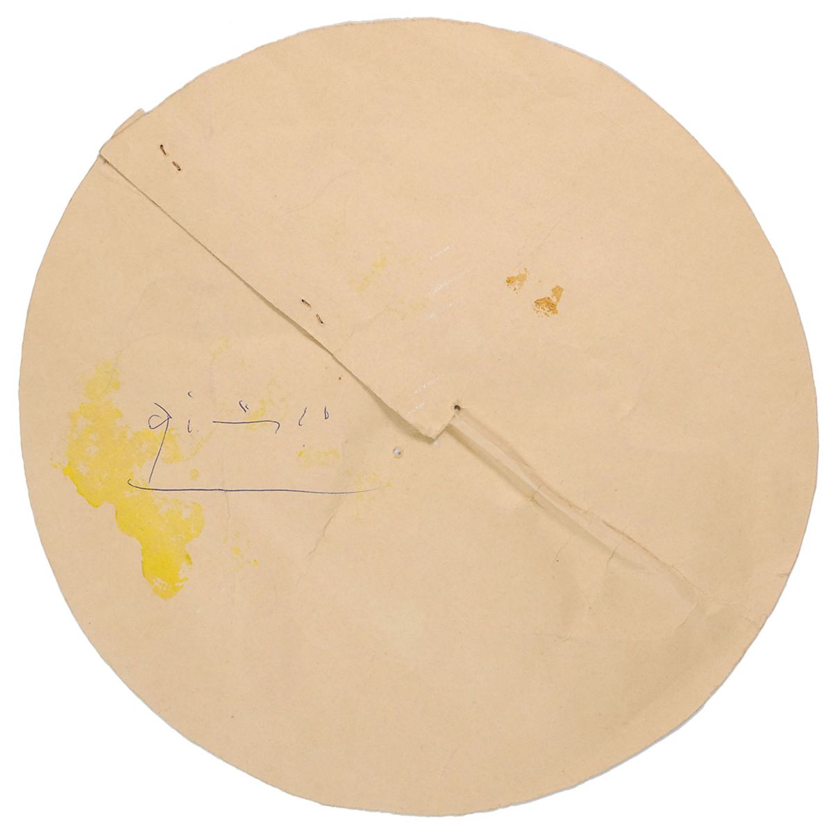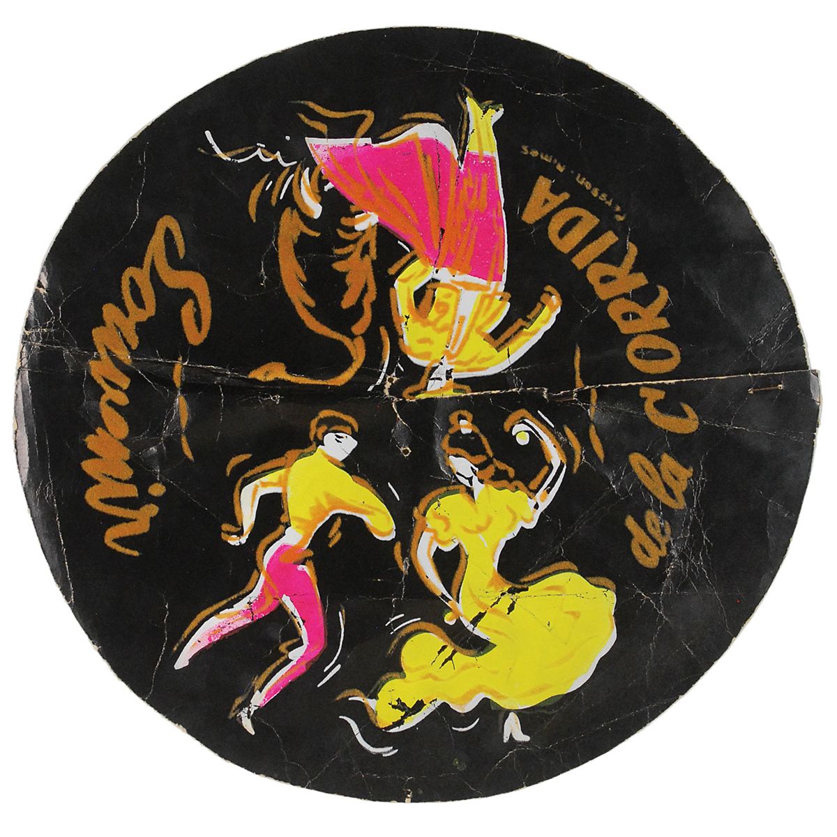 Colorful unformed souvenir hat, 12.5? in diameter, circa 1960, depicting three stylized flamenco dancers with the legend: “Souvenir de la CORRIDA” (“Souvenir of the BULLFIGHT”), printed around the outside edge. Signed on the reverse in blue ballpoint, “Picasso.” When curled and stapled, a cone-shaped hat was formed. This type of hats was sold outside the bullring at Nimes, France, by vendors to provide relief from the blaring sun. In very good condition, with staples, holes, and scattered creasing, and some light discoloration surrounding signature, but not affecting the legibility. Wonderful association as the artist was a passionate fan of bullfighting, painting many portraits of the sport throughout his career.