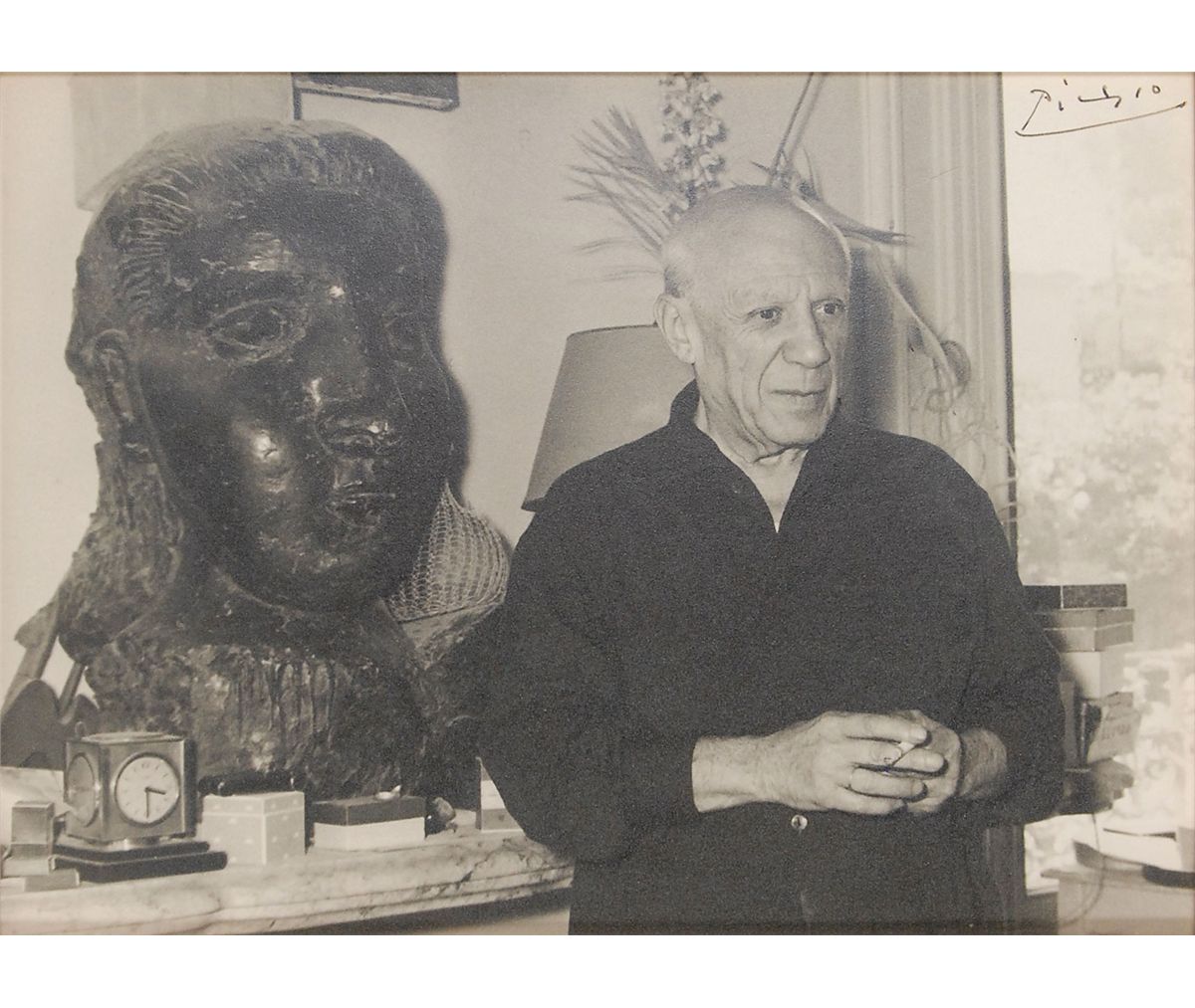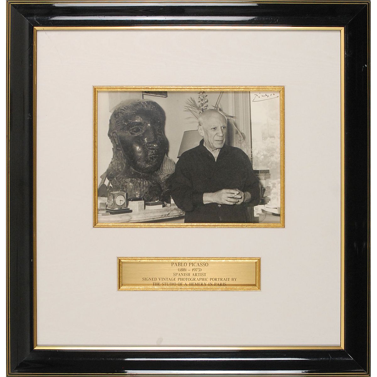 Matte-finish 9 x 6.5 photo of Picasso, a cigarette in hand, posing in front of a large bust, taken by the studio of A. Hemery of Paris, signed in the upper right in black ink, “Picasso.” Nicely matted and framed with a descriptive plaque to an overall size of 18.5 x 19. In fine condition. Signed photos of the artist of this quality are quite uncommon.