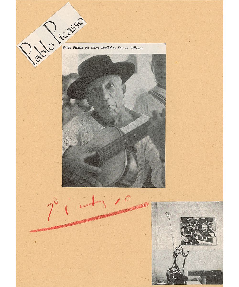 Large red pencil signature, “Picasso,” on an off-white 7.25 x 10 sheet bearing affixed images of the artist playing a guitar and a painting. Affixed to a slightly larger cardstock sheet. In fine condition.