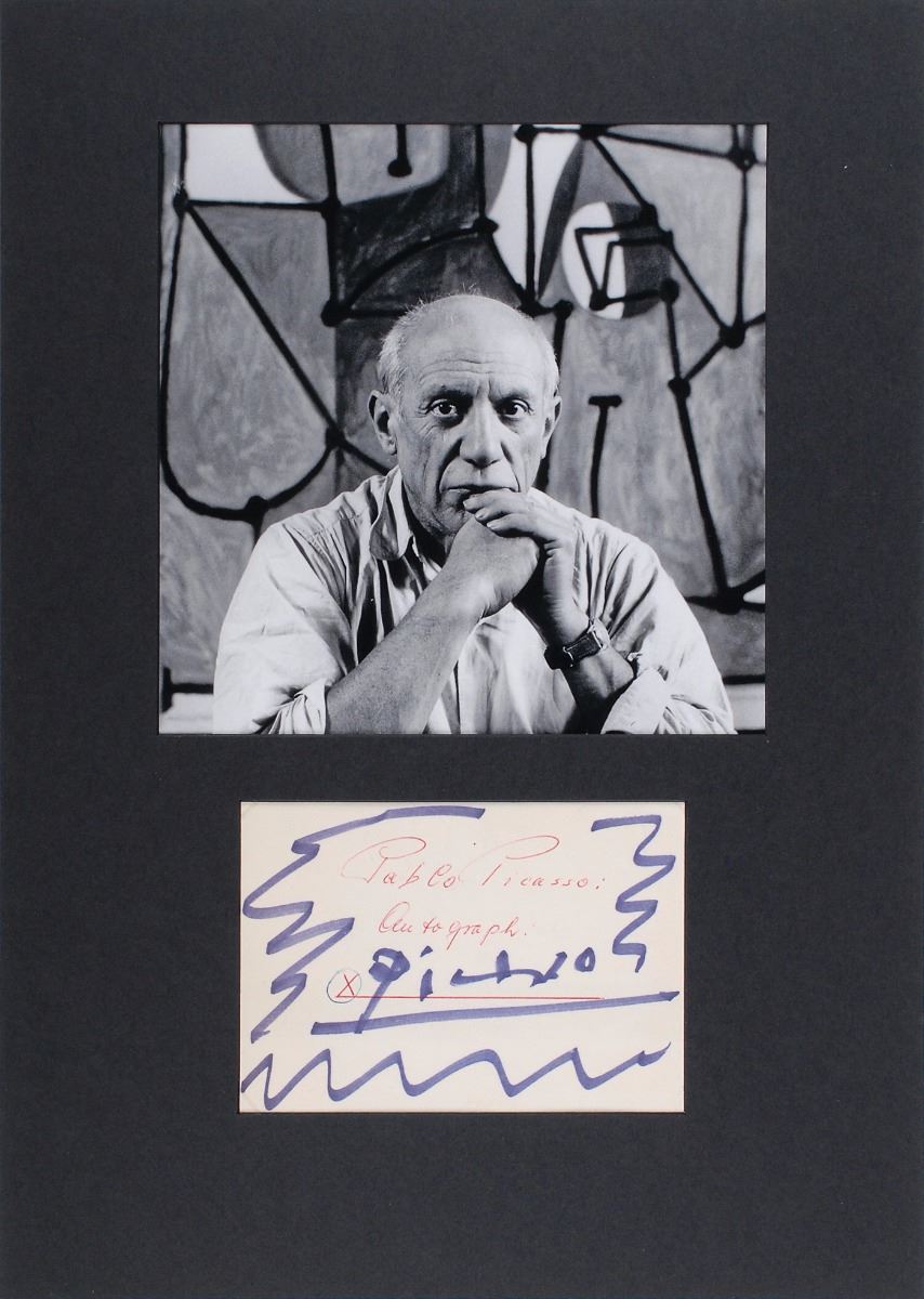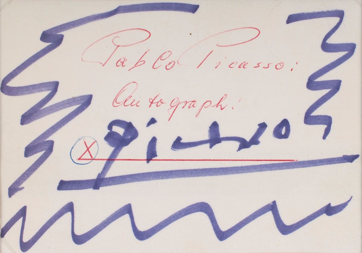 Large felt tip signature, “Picasso,” on an off-white 5.75 x 4 card, embellished by the artist with a thick wavy border. The card also bears several red ballpoint collector’s notations. Nicely matted with a portrait of Picasso to an overall size of 11.75 x 16.5. In fine condition.