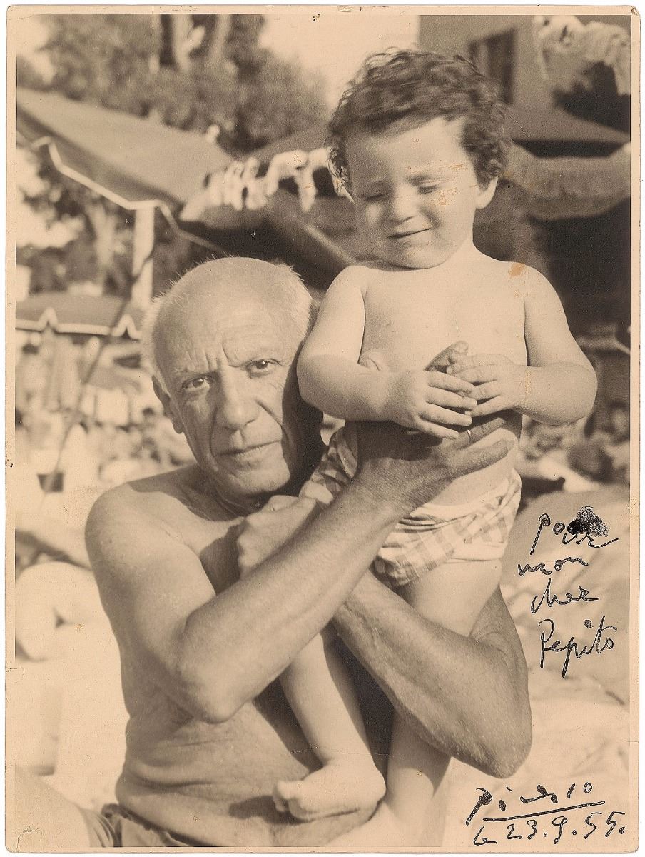 Exceptional matte-finish 7 x 9.25 photo of the great artist hoisting a young child onto his shoulder, signed and inscribed in black ink, “Pour mon cher Pepito, Picasso, le 23.9.55.” In fine condition, with two small tears to lower left corner. Accompanied by two smaller original unsigned snapshots of Picasso with the same child inside a restaurant.