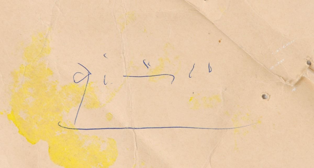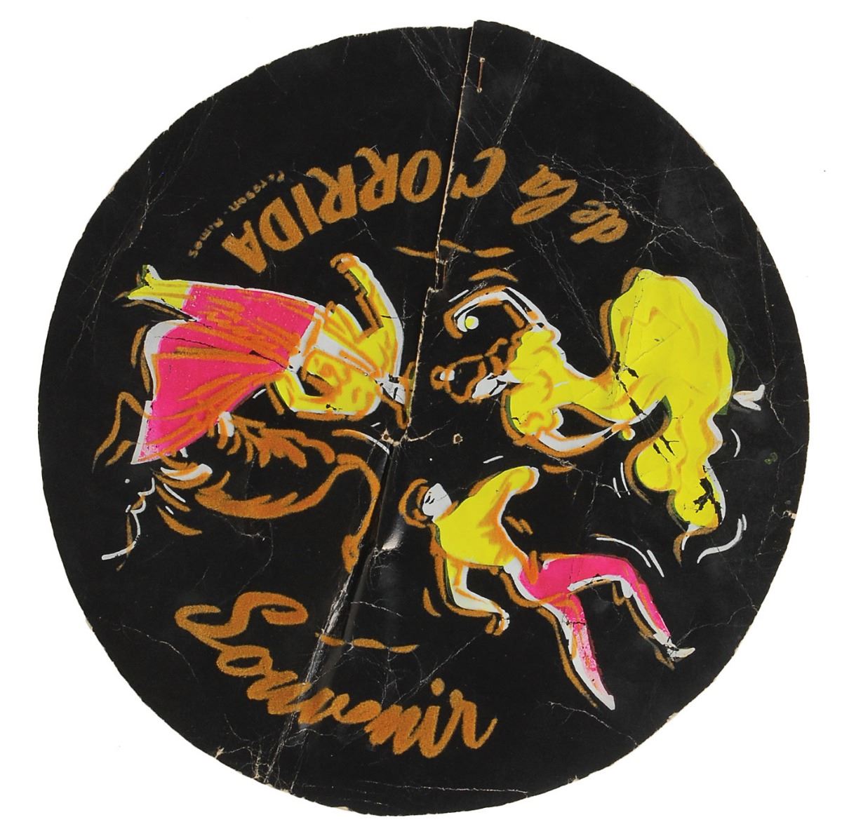 Colorful cardboard bullfighting souvenir, perhaps a fan, measuring 12.5? in diameter, signed on the reverse in blue ballpoint, “Picasso.” In very good condition, with heavy overall creasing and a yellow stain touching the start of the signature.