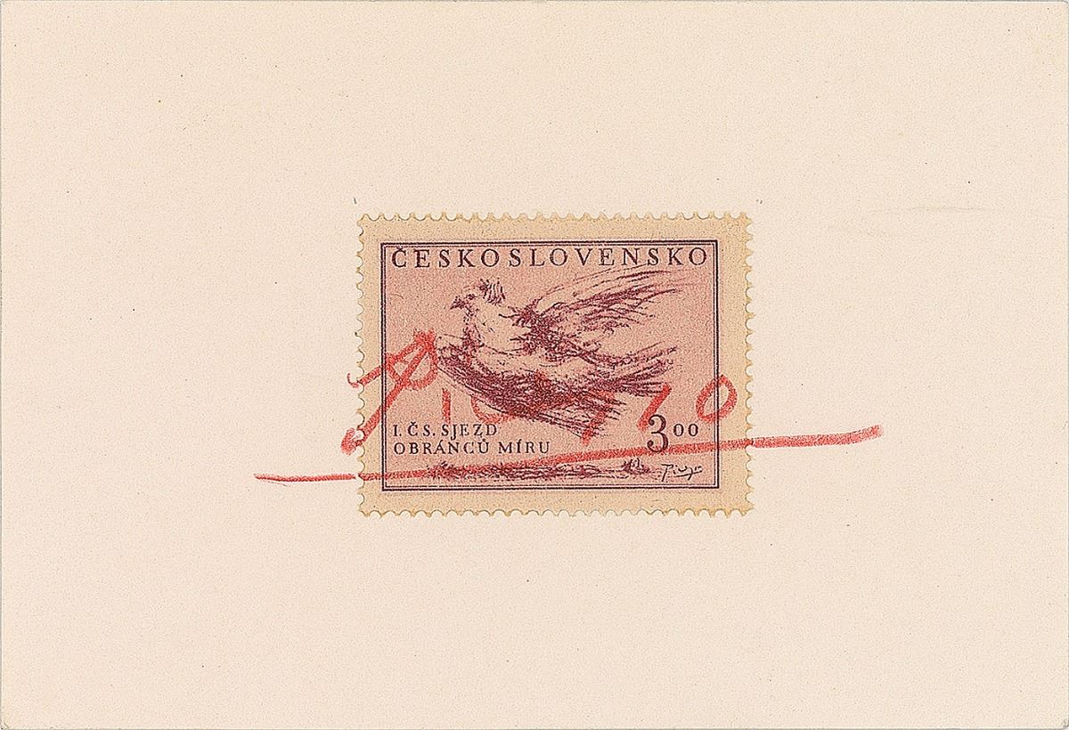 Czechoslovakian postage stamp affixed to an off-white 3.75 x 2.5 card, signed in red artist’s pencil, “Picasso.” In fine condition.