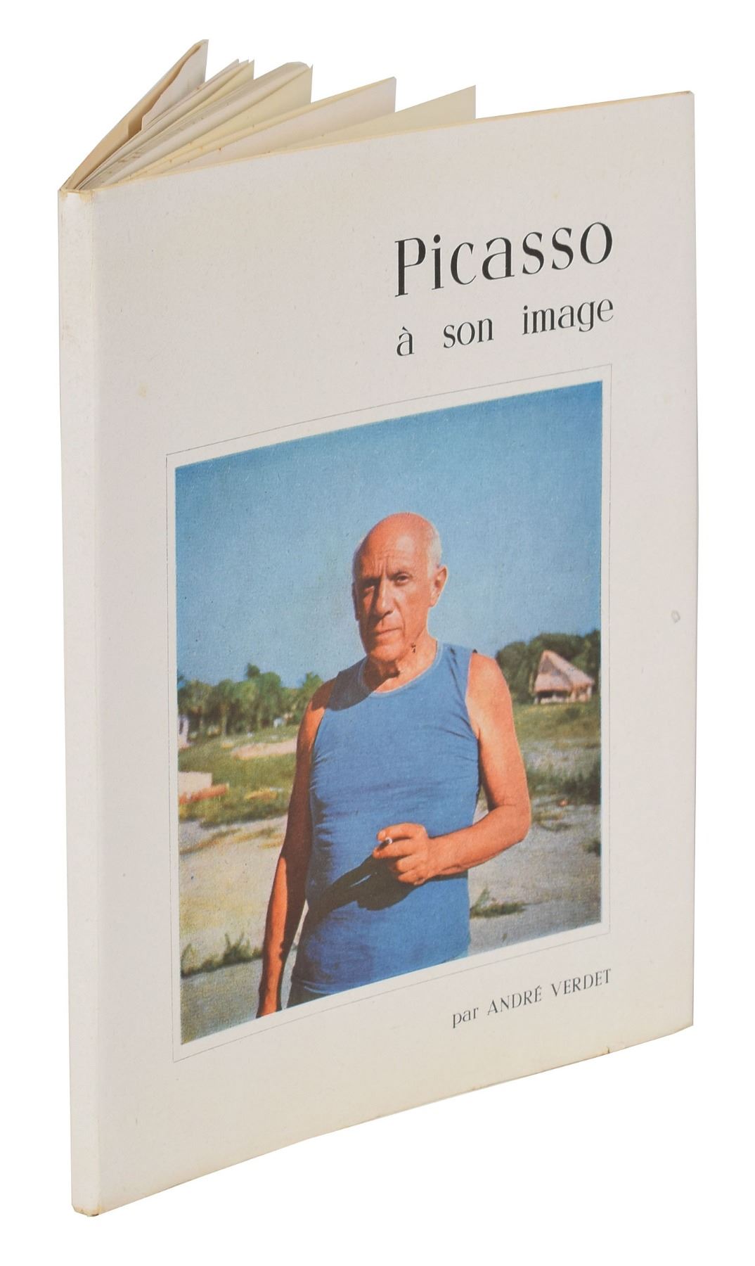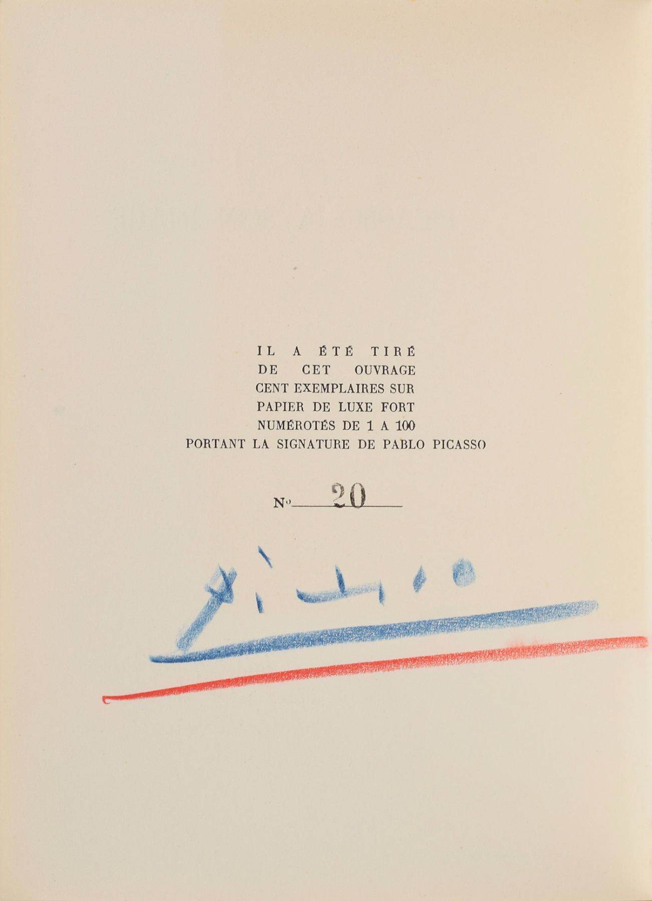 Signed book: Picasso A Son Image. Limited edition, numbered 20/100. Nice, France: Galerie H. Matarasso, 1956. Softcover, 5.75 x 7.25. Signed on the colophon in blue and red artist pencil, "Picasso." In fine condition.