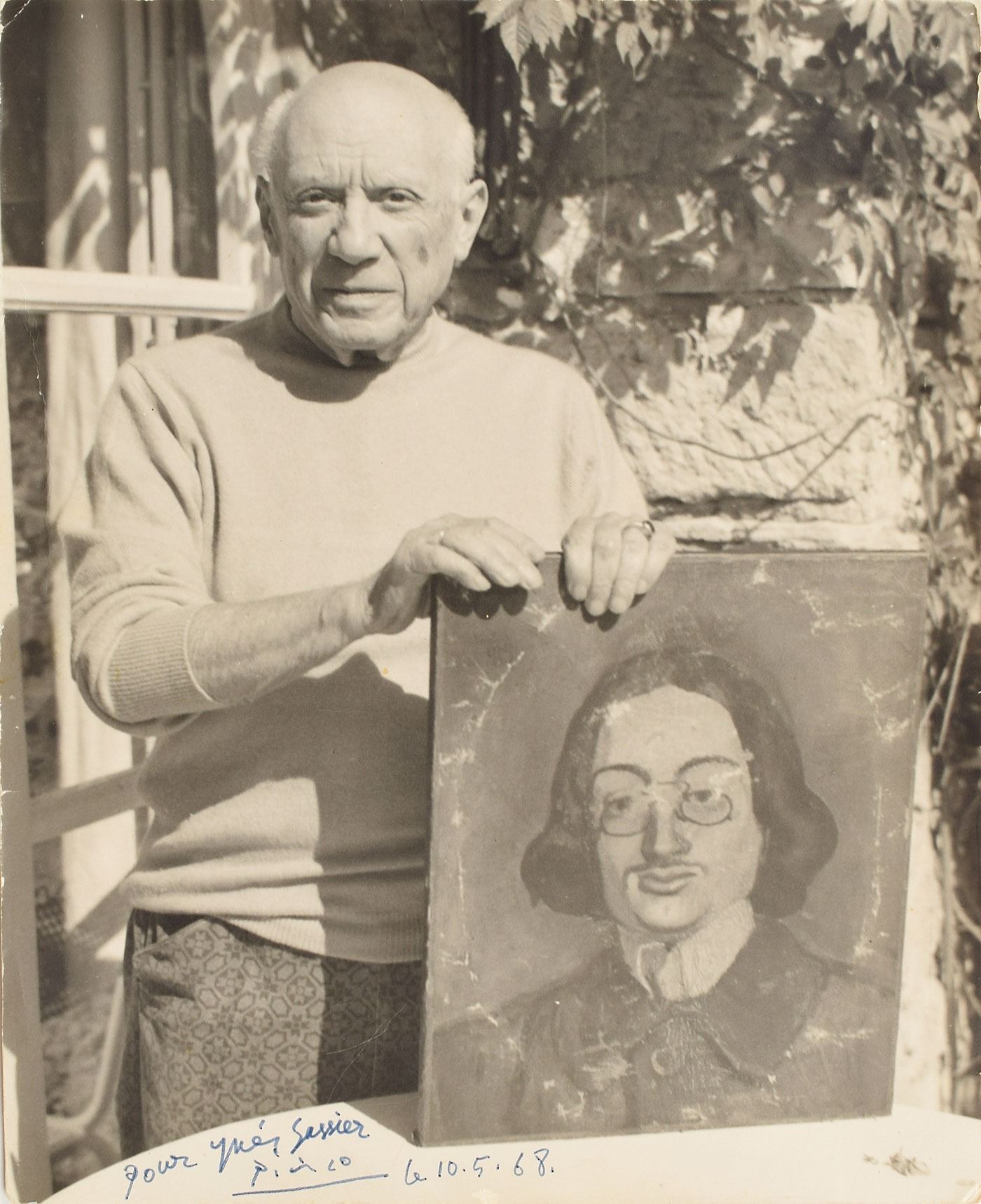Exceptional matte-finish 9.25 x 11.75 photo of Picasso posing with his portrait of his lifelong best friend, the Spanish artist-writer Jaime Sabartes, signed and inscribed in black felt tip, "Pour Ines Sassier, Picasso, le 10.5.68.” In fine condition, with a fleck of emulsion loss beneath the date.