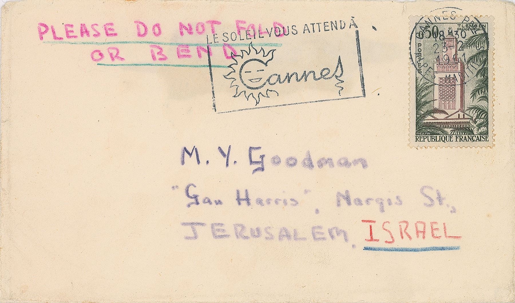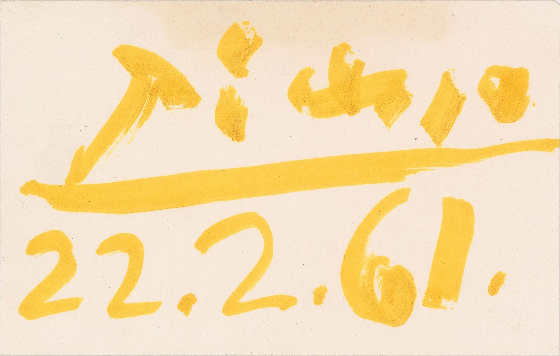 Impressive thick yellow ink signature, "Picasso, 22.2.61,” on an off-white 4.25 x 2.75 envelope. In fine condition, with light toning along the top edge. Accompanied by the original mailing envelope.