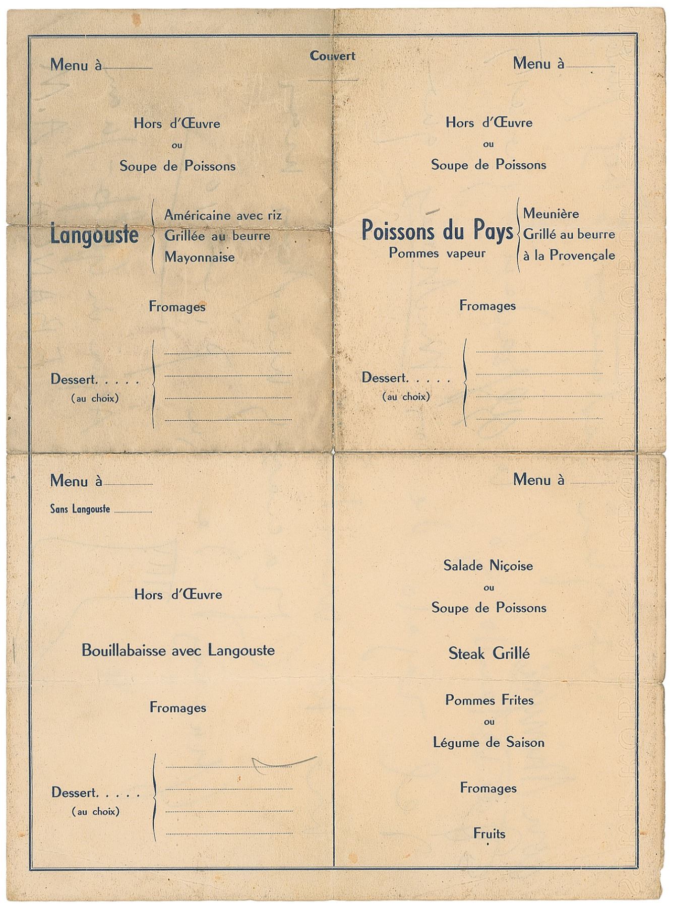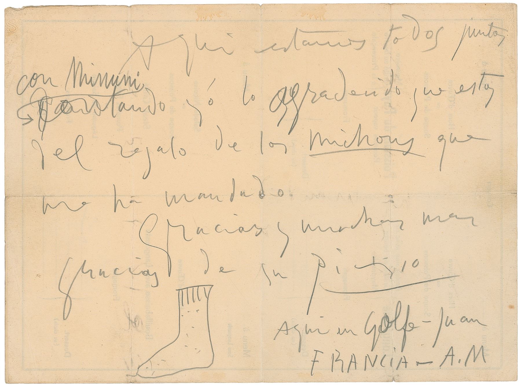 ALS in pencil, in Spanish, signed “Picasso,” one page on the reverse of a 12.5 x 9.25 menu, no date. Picasso writes to thank his friend for sending him some socks, sketching a sock at the bottom. He also writes that he is with “Minuni,” a bullfighter whose hospital expenses had been paid by Picasso after seeing him injured in the ring. In very good to fine condition, with light handling wear, and small holes at fold intersections. A large, impressive letter featuring an original sketch by one of the most famous artists of the 20th century.