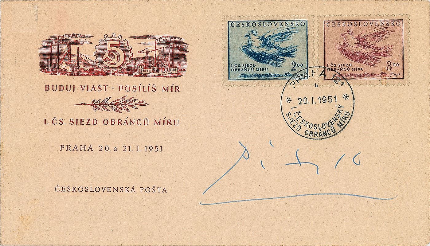 Commemorative cover bearing two Czechoslovakian postage stamps designed by Picasso, prominently signed in blue ballpoint, "Picasso." Postmarked January 20, 1951. In fine condition, with scattered light creasing.