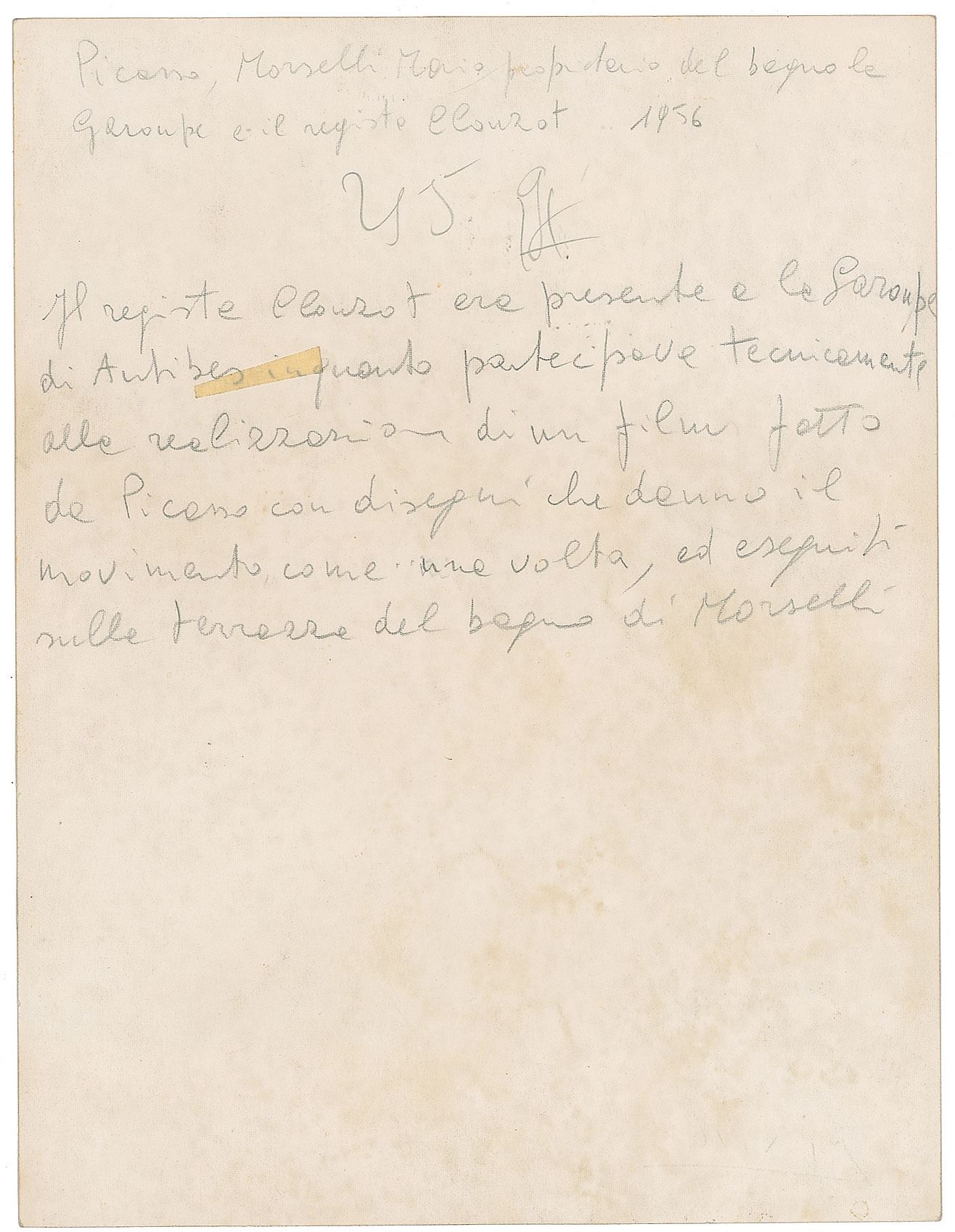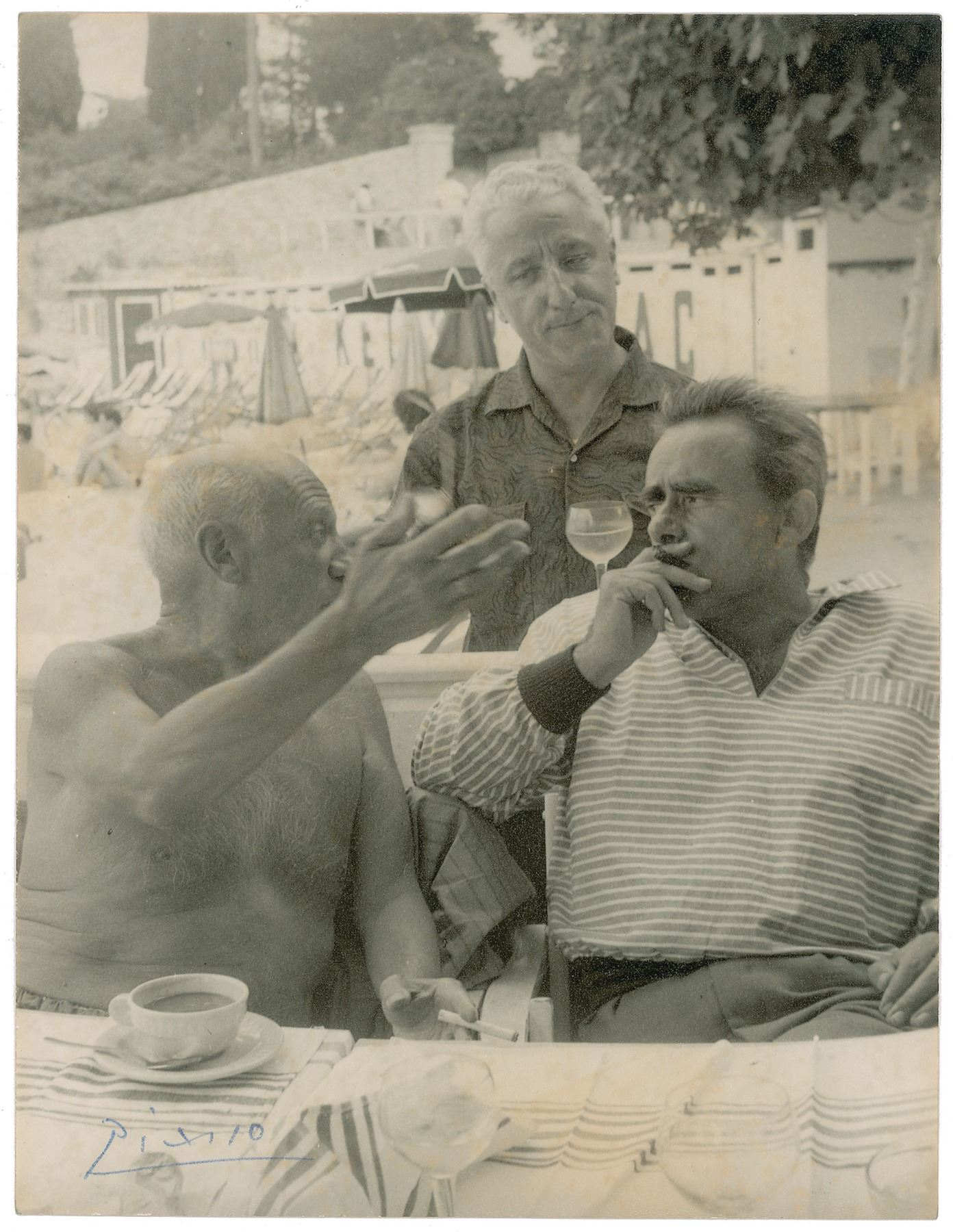 Marvelous vintage matte-finish 7 x 9.25 photo of Picasso shirtless and seated at a table having coffee alongside filmmaker Henri-Georges Clouzot, signed in the lower left corner in blue ballpoint, "Picasso." Picasso raises his arm as he explains something to Clouzot, who listens closely as he smokes. The reverse bears pencil notations by the restaurant owner where the photograph was obtained in Antibes, 1956. In fine condition. The French film director Henri-Georges Clouzot directed the documentary film The Mystery of Picasso (1956), which was declared a national treasure by the government of France.